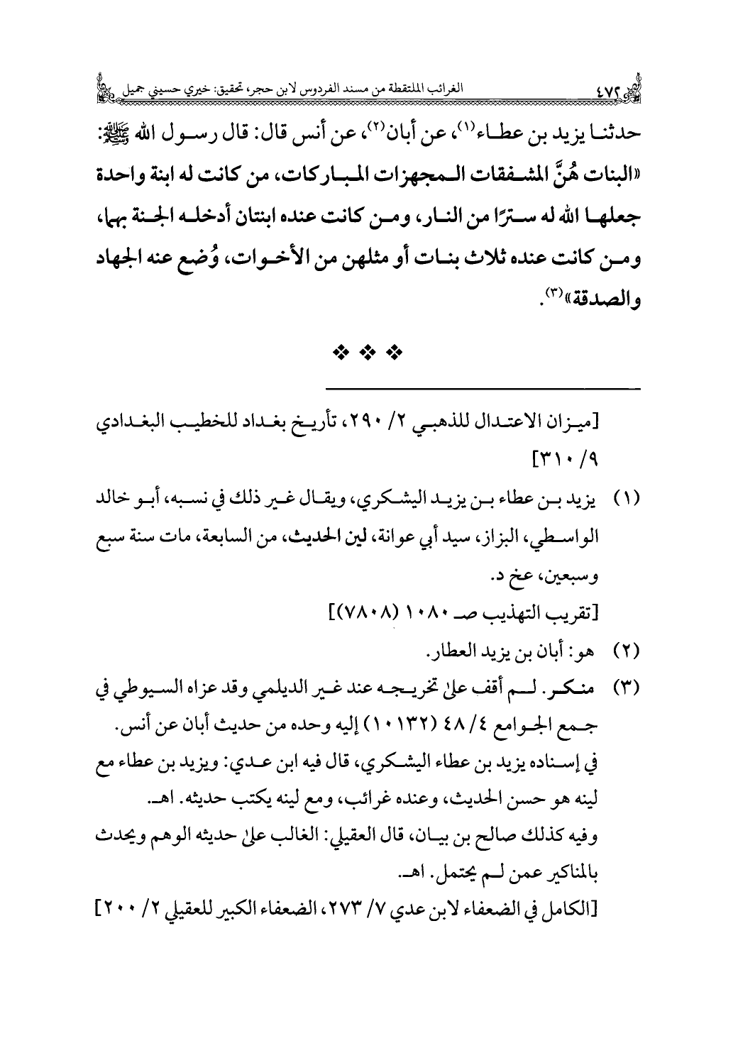 حدثنا يزيد بن عطاء (¬١)، عن أبان (¬٢)، عن أنس قال: قال رسول الله - صلى الله عليه وسلم -: "البنات هُنَّ المشفقات المجهزات المباركات، من كانت له ابنة واحدة جعلها الله له سترًا من النار، ومن كانت عنده ابنتان أدخله الجنة بهما، ومن كانت عنده ثلاث بنات أو مثلهن من الأخوات، وُضع عنه الجهاد والصدقة" (¬٣).
