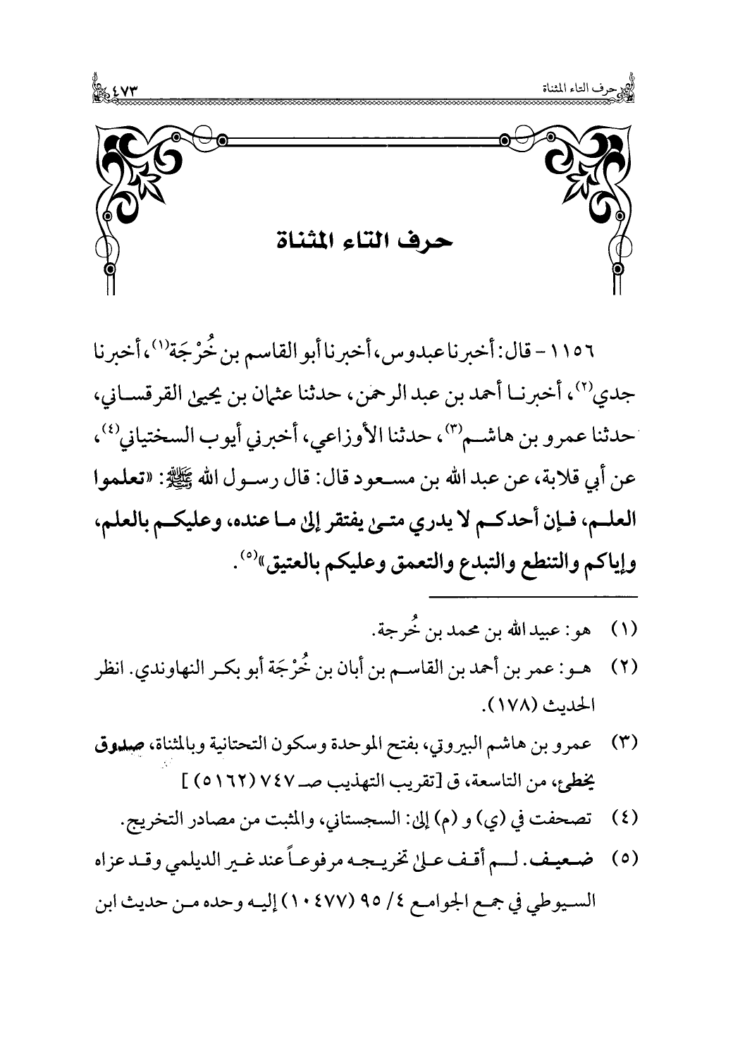 ١١٥٦ - قال: أخبرنا عبدوس، أخبرنا أبو القاسم بن خُرْجَة (¬١)، أخبرنا جدي (¬٢)، أخبرنا أحمد بن عبد الرحمن، حدثنا عثمان بن يحيى القرقساني، حدثنا عمرو بن هاشم (¬٣)، حدثنا الأوزاعي، أخبرني أيوب السختياني (¬٤)، عن أبي قلابة، عن عبد الله بن مسعود قال: قال رسول الله - صلى الله عليه وسلم -: "تعلموا العلم، فإن أحدكم لا يدري متى يفتقر إلى ما عنده، وعليكم بالعلم، وإياكم والتنطع والتبدع والتعمق وعليكم بالعتيق" (¬٥).