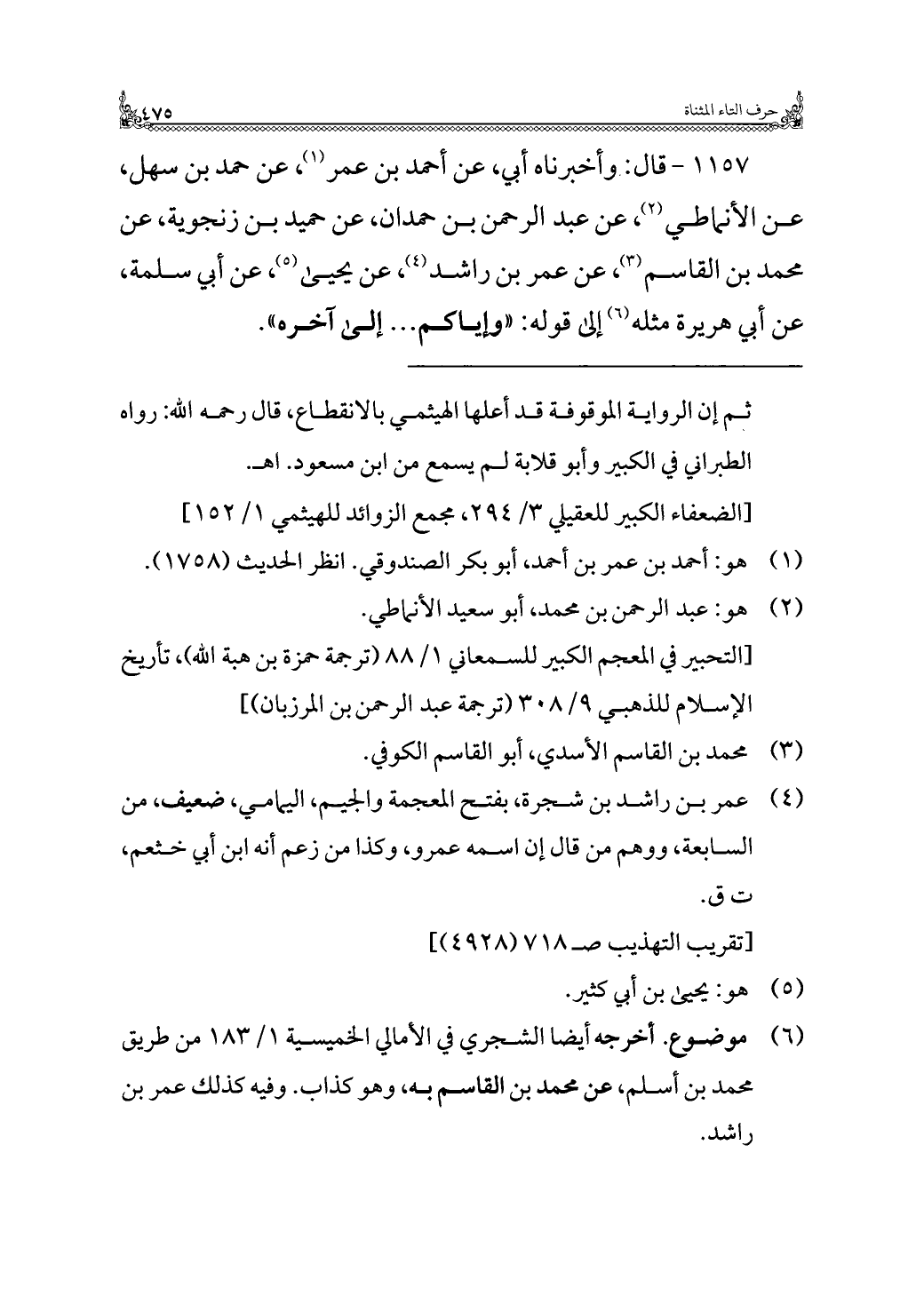 ١١٥٧ - قال: وأخبرناه أبي، عن أحمد بن عمر (¬١)، عن حمد بن سهل، عن الأنماطي (¬٢)، عن عبد الرحمن بن حمدان، عن حميد بن زنجوية، عن محمد بن القاسم (¬٣)، عن عمر بن راشد (¬٤)، عن يحيى (¬٥)، عن أبي سلمة، عن أبي هريرة مثله (¬٦) إلى قوله: "وإياكم. . . إلى آخره".