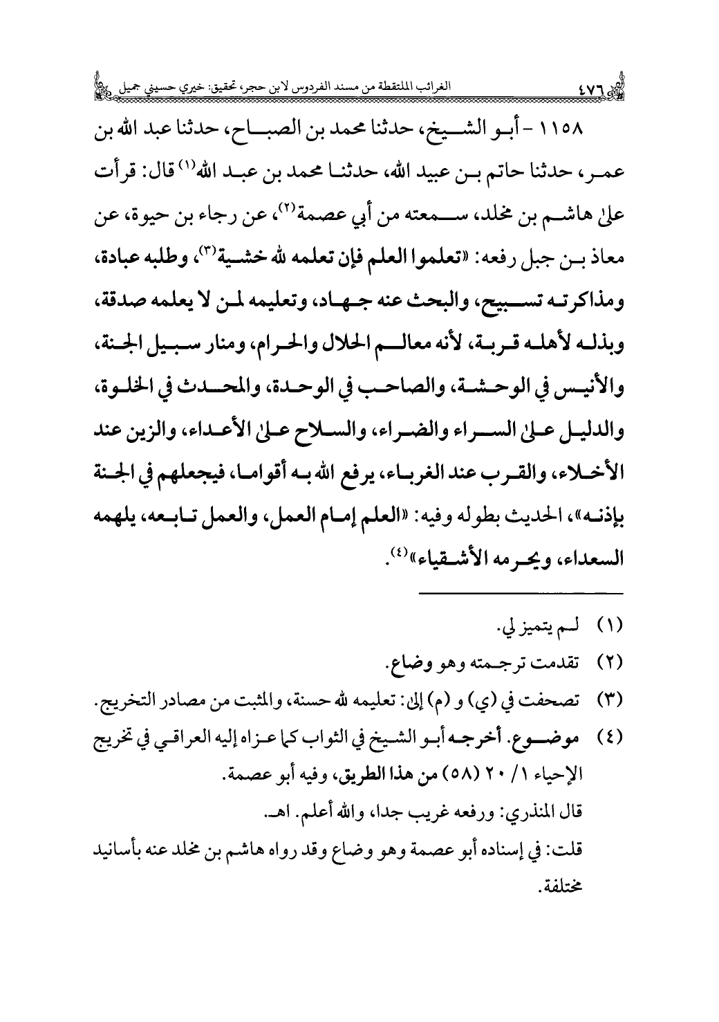 ١١٥٨ - أبو الشيخ، حدثنا محمد بن الصباح، حدثنا عبد الله بن عمر، حدثنا حاتم بن عبيد الله، حدثنا محمد بن عبد الله (¬١) قال: قرأت على هاشم بن مخلد، سمعته من أبي عصمة (¬٢)، عن رجاء بن حيوة، عن معاذ بن جبل رفعه: "تعلموا العلم فإن تعلمه لله خشية (¬٣)، وطلبه عبادة، ومذاكرته تسبيح، والبحث عنه جهاد، وتعليمه لمن لا يعلمه صدقة، وبذله لأهله قربة, لأنه معالم الحلال والحرام، ومنار سبيل الجنة، والأنيس في الوحشة، والصاحب في الوحدة، والمحدث في الخلوة، والدليل على السراء والضراء، والسلاح على الأعداء، والزين عند الأخلاء، والقرب عند الغرباء، يرفع الله به أقواما، فيجعلهم في الجنة بإذنه"، الحديث بطوله وفيه: "العلم إمام العمل، والعمل تابعه، يلهمه السعداء، ويحرمه الأشقياء" (¬٤).