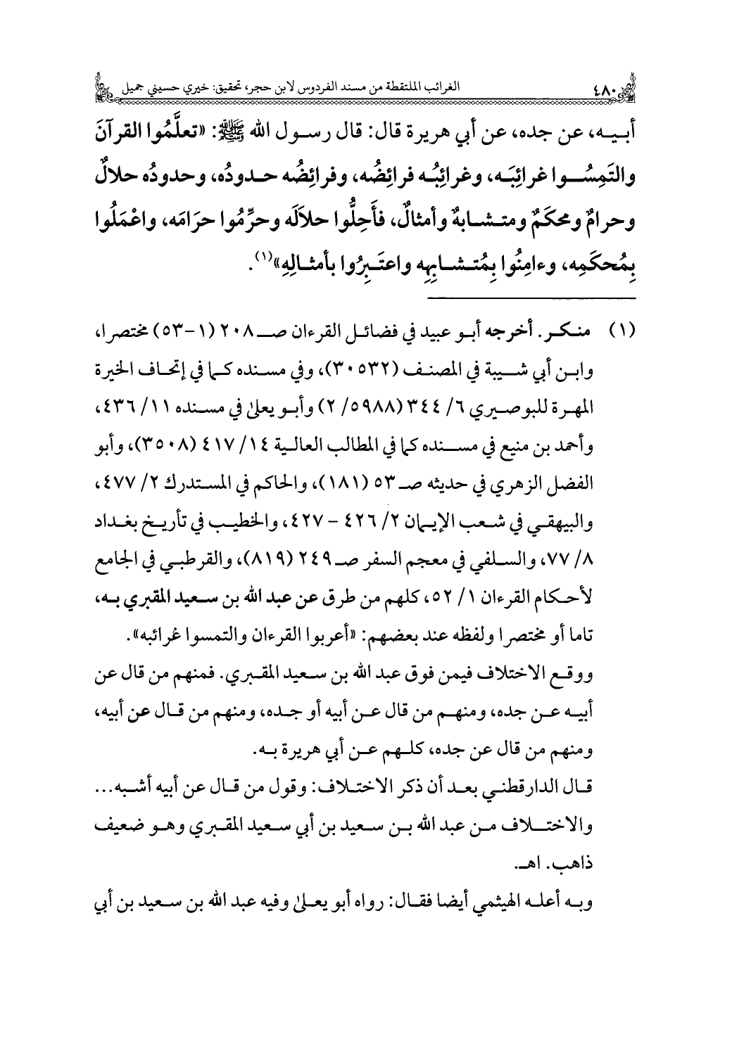 (¬١) منكر. أخرجه أبو عبيد في فضائل القرآن صـ ٢٠٨ (١ - ٥٣) مختصرًا، وابن أبي شيبة في المصنف (٣٠٥٣٢)، وفي مسنده كما في إتحاف الخيرة المهرة للبوصيري ٦/ ٣٤٤ (٥٩٨٨/ ٢) وأبو يعلى في مسنده ١١/ ٤٣٦، وأحمد بن منيع في مسنده كما في المطالب العالية ١٤/ ٤١٧ (٣٥٠٨)، وأبو الفضل الزهري في حديثه صـ ٥٣ (١٨١)، والحاكم في المستدرك ٢/ ٤٧٧، والبيهقي في شعب الإيمان ٢/ ٤٢٦ - ٤٢٧، والخطيب في تاريخ بغداد ٨/ ٧٧، والسلفي في معجم السفر صـ ٢٤٩ (٨١٩)، والقرطبي في الجامع لأحكام القرآن ١/ ٥٢، كلهم من طرق عن عبد الله بن سعيد المقبري به، تاما أو مختصرًا ولفظه عند بعضهم: "أعربوا القرآن والتمسوا غرائبه".