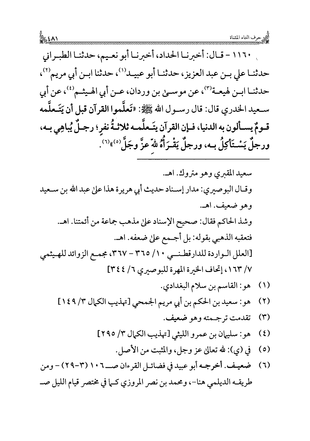 ١١٦٠ - قال: أخبرنا الحداد، أخبرنا أبو نعيم، حدثنا الطبراني حدثنا علي بن عبد العزيز، حدثنا أبو عبيد (¬١)، حدثنا ابن أبي مريم (¬٢)، حدثنا ابن لهيعة (¬٣)، عن موسى بن وردان، عن أبي الهيثم (¬٤)، عن أبي سعيد الخدري قال: قال رسول الله - صلى الله عليه وسلم -: "تَعلَّموا القرآن قبل أن يَتَعلَّمه قومٌ يسألون به الدنيا، فإن القرآن يتَعلَّمه ثلاثةُ نفرٍ؛ رجلٌ يُباهِي به، ورجلٌ يَسْتَأكِلُ به، ورجلٌ يَقْرَأُهُ للهِ عزَّ وجَلَّ (¬٥) " (¬٦).