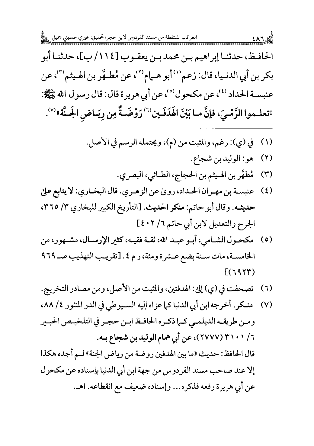 الحافظ، حدثنا إبراهيم بن محمد بن يعقوب، حدثنا أبو بكر بن أبي الدنيا، قال: زعم (¬١) أبو همام (¬٢)، عن مُطهَّر بن الهيثم (¬٣)، عن عنبسة الحداد (¬٤)، عن مكحول (¬٥)، عن أبي هريرة قال: قال رسول الله - صلى الله عليه وسلم -: "تعلموا الرَّمْيَ، فإنَّ ما بَيْنَ الهَدَفَين (¬٦) رَوْضَةٌ مِن رِيَاضِ الجَنَّة" (¬٧).
