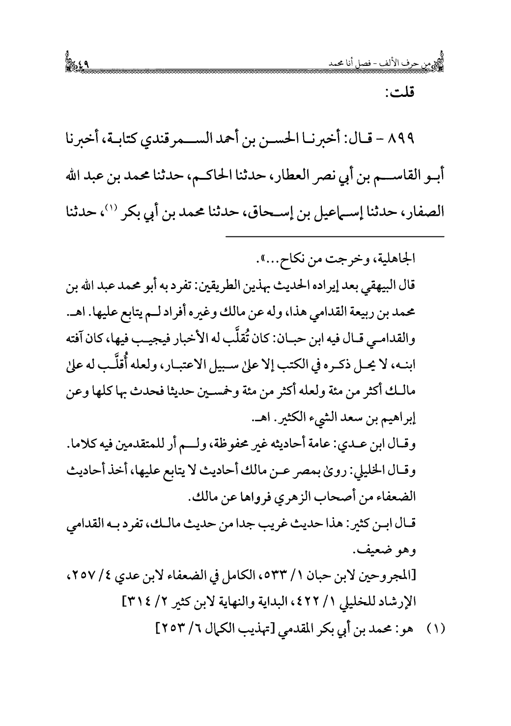 ٨٩٩ - قال: أخبرنا الحسن بن أحمد السمرقندي كتابة، أخبرنا أبو القاسم بن أبي نصر العطار، حدثنا الحاكم، حدثنا محمَّد بن عبد الله الصفار، حدثنا إسماعيل بن إسحاق، حدثنا محمَّد بن أبي بكر (¬١)، حدثنا