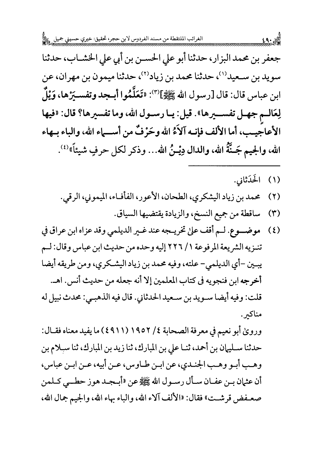 جعفر بن محمد البزار، حدثنا أبو علي الحسن بن أبي علي الخشاب، حدثنا سويد بن سعيد (¬١)، حدثنا محمد بن زياد (¬٢)، حدثنا ميمون بن مهران، عن ابن عباس قال: قال [رسول الله - صلى الله عليه وسلم -] (¬٣): "تَعَلَّمُوا أبجد وتفسيْرَها، وَيْلٌ لِعَالمٍ جهل تفسيرها". قيل: يا رسول الله، وما تفسيرها؟ قال: "فيها الأعاجيب، أما الألف فإنه آلَاءُ الله وحَرْفٌ من أسماء الله، والباء بهاء الله، والجيم جَنَّةُ الله، والدال دِيْنُ الله. . . وذكر لكل حرفٍ شيئًا" (¬٤).