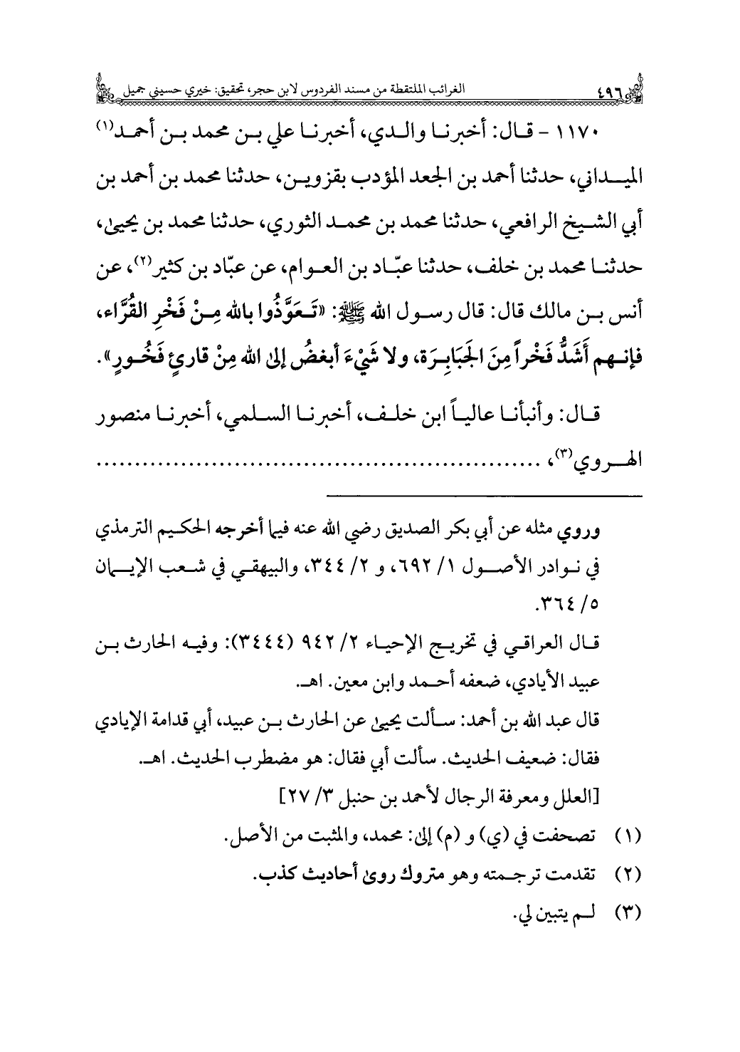 ١١٧٠ - قال: أخبرنا والدي، أخبرنا علي بن محمد بن أحمد (¬١) الميداني، حدثنا أحمد بن الجعد المؤدب بقزوين، حدثنا محمد بن أحمد بن أبي الشيخ الرافعي، حدثنا محمد بن محمد الثوري، حدثنا محمد بن يحيى، حدثنا محمد بن خلف، حدثنا عبّاد بن العوام، عن عبّاد بن كثير (¬٢)، عن أنس بن مالك قال: قال رسول الله - صلى الله عليه وسلم -: "تَعَوَّذُوا بالله مِنْ فَخْرِ القُرَّاء، فإنهم أَشَدُّ فَخْرًا مِنَ الجَبَابِرَة، ولا شَيْءَ أبغضُ إلى الله مِنْ قارئٍ فَخُورٍ".