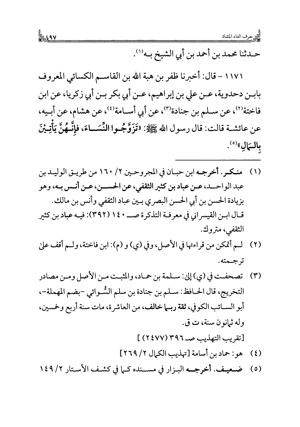 ١١٧١ - قال: أخبرنا ظفر بن هبة الله بن القاسم الكسائي المعروف بابن دحدوية، عن علي بن إبراهيم، عن أبي بكر بن أبي زكريا، عن ابن فاختة (¬٢)، عن سلم بن جنادة (¬٣)، عن أبي أسامة (¬٤)، عن هشام، عن أبيه، عن عائشة قالت: قال رسول الله - صلى الله عليه وسلم -: "تَزَوَّجُوا النِّسَاءَ، فإِنَّهُنَّ يَأْتِيْنَ بِالمَالِ" (¬٥).