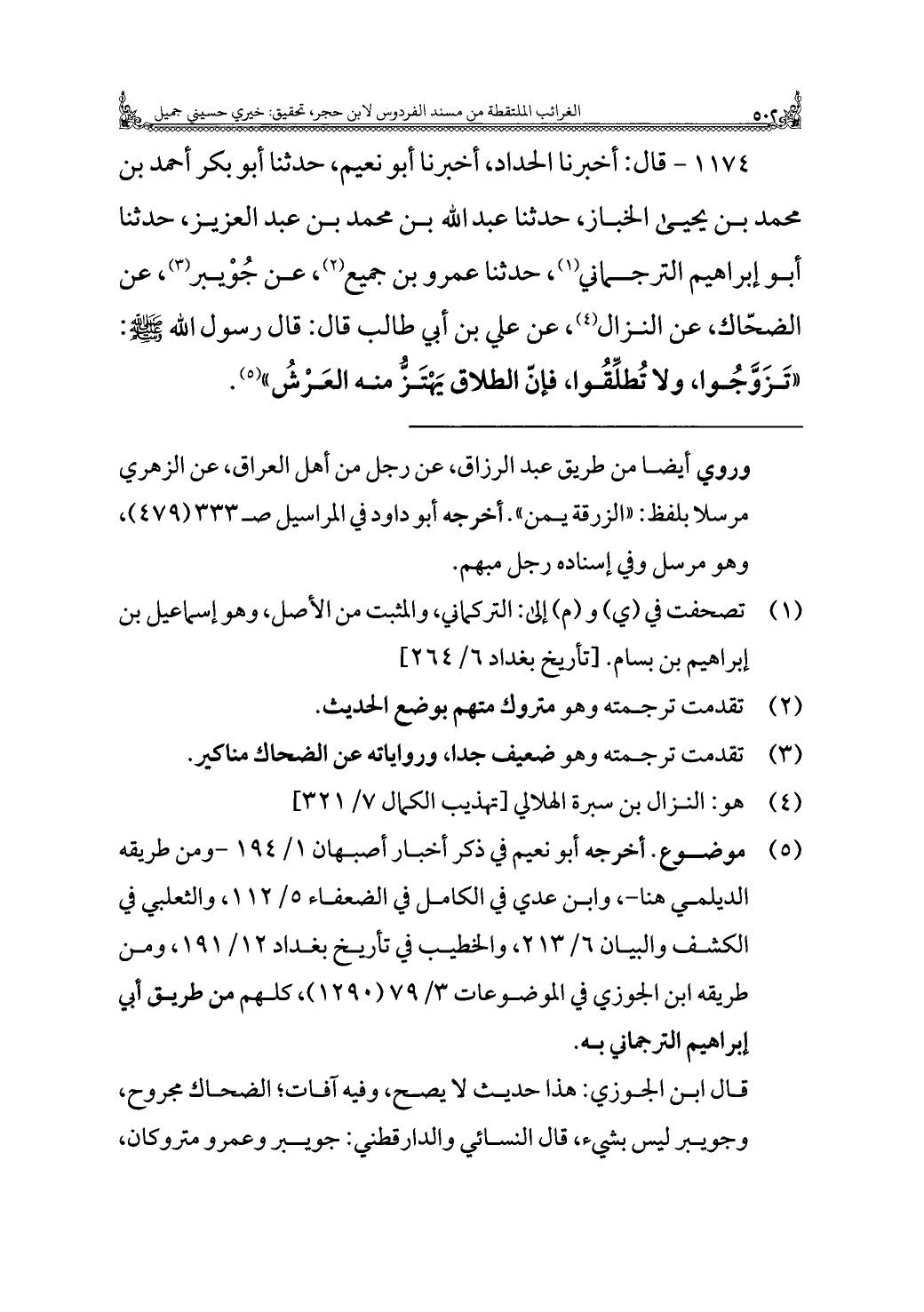 ١١٧٤ - قال: أخبرنا الحداد، أخبرنا أبو نعيم، حدثنا أبو بكر أحمد بن محمد بن يحيى الخباز، حدثنا عبد الله بن محمد بن عبد العزيز، حدثنا أبو إبراهيم الترجماني (¬١)، حدثنا عمرو بن جميع (¬٢)، عن جُوْيبر (¬٣)، عن الضحّاك، عن النزال (¬٤)، عن علي بن أبي طالب قال: قال رسول الله - صلى الله عليه وسلم -: "تَزَوَّجُوا، ولا تُطلِّقُوا، فإنّ الطلاق يَهْتَزُّ منه العَرْشُ" (¬٥).