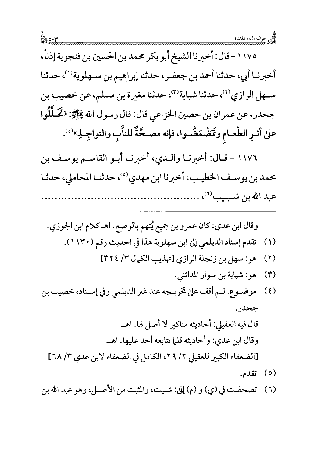 ١١٧٥ - قال: أخبرنا الشيخ أبو بكر محمد بن الحسين بن فنجوية إذنًا، أخبرنا أبي، حدثنا أحمد بن جعفر، حدثنا إبراهيم بن سهلوية (¬١)، حدثنا سهل الرازي (¬٢)، حدثنا شبابة (¬٣)، حدثنا مغيرة بن مسلم، عن خصيب بن جحدر، عن عمران بن حصين الخزاعي قال: قال رسول الله - صلى الله عليه وسلم -: "تَخَلَّلُوا على أثرِ الطّعامِ وتَمَضْمَضُوا، فإنه مصحَّةٌ للنَّابِ والنواجِذِ" (¬٤).