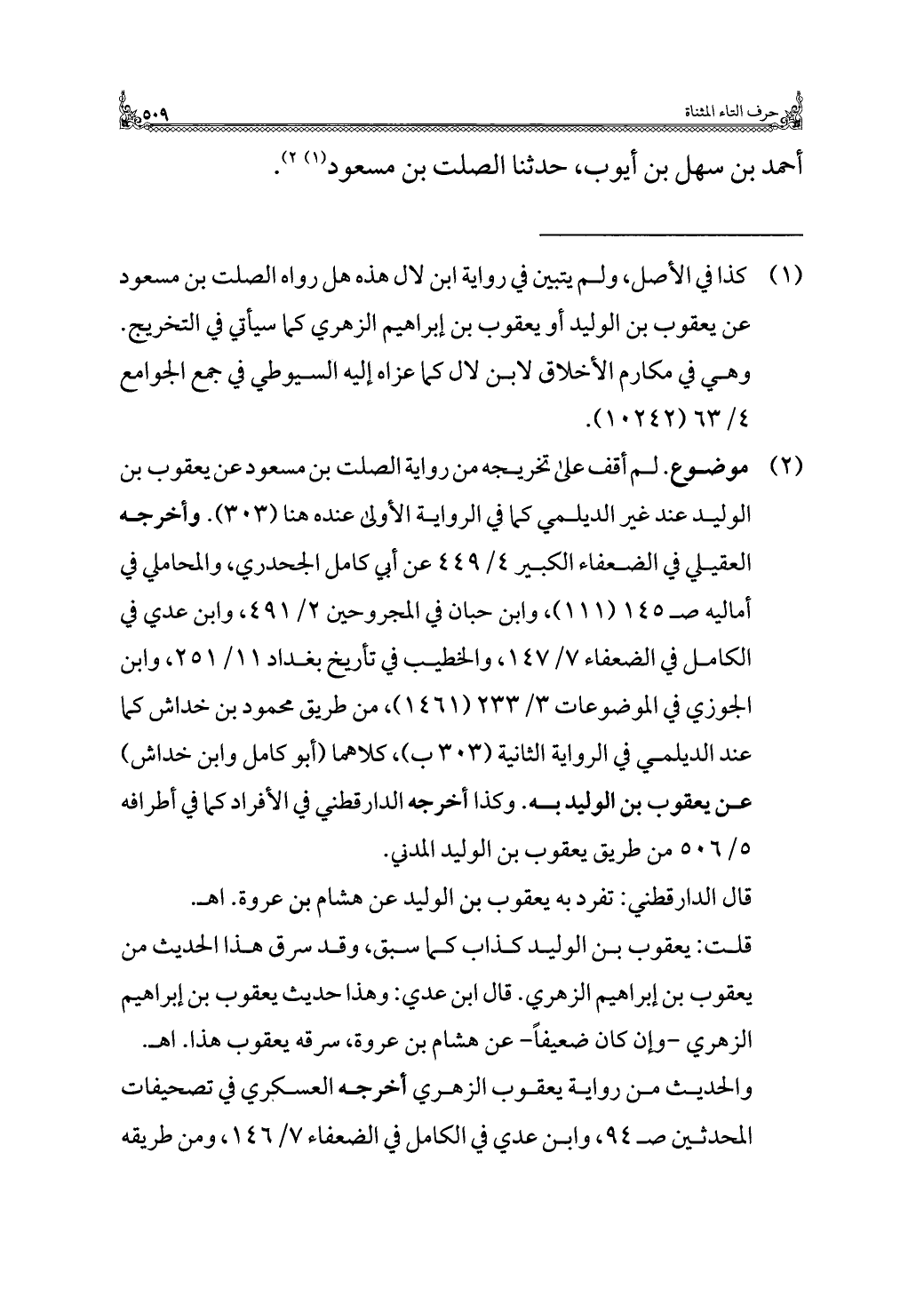 (¬١) كذا في الأصل، ولم يتبين في رواية ابن لال هذه هل رواه الصلت بن مسعود عن يعقوب بن الوليد أو يعقوب بن إبراهيم الزهري كما سيأتي في التخريج. وهي في مكارم الأخلاق لابن لال كما عزاه إليه السيوطي في جمع الجوامع ٤/ ٦٣ (١٠٢٤٢).
