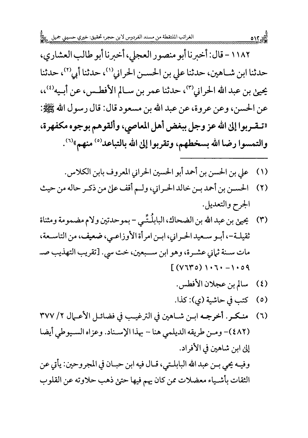 ١١٨٢ - قال: أخبرنا أبو منصور العجلي، أخبرنا أبو طالب العشاري، حدثنا ابن شاهين، حدثنا علي بن الحسن الحراني (¬١)، حدثنا أبي (¬٢)، حدثنا يحيى بن عبد الله الحراني (¬٣)، حدثنا عمر بن سالم الأفطس، عن أبيه (¬٤)، ، عن الحسن، وعن عروة، عن عبد الله بن مسعود قال: قال رسول الله - صلى الله عليه وسلم -: "تقربوا إلى الله عز وجل ببغض أهل المعاصي، وألقوهم بوجوه مكفهرة، والتمسوا رضا الله بسخطهم، وتقربوا إلى الله بالتباعد (¬٥) منهم" (¬٦).