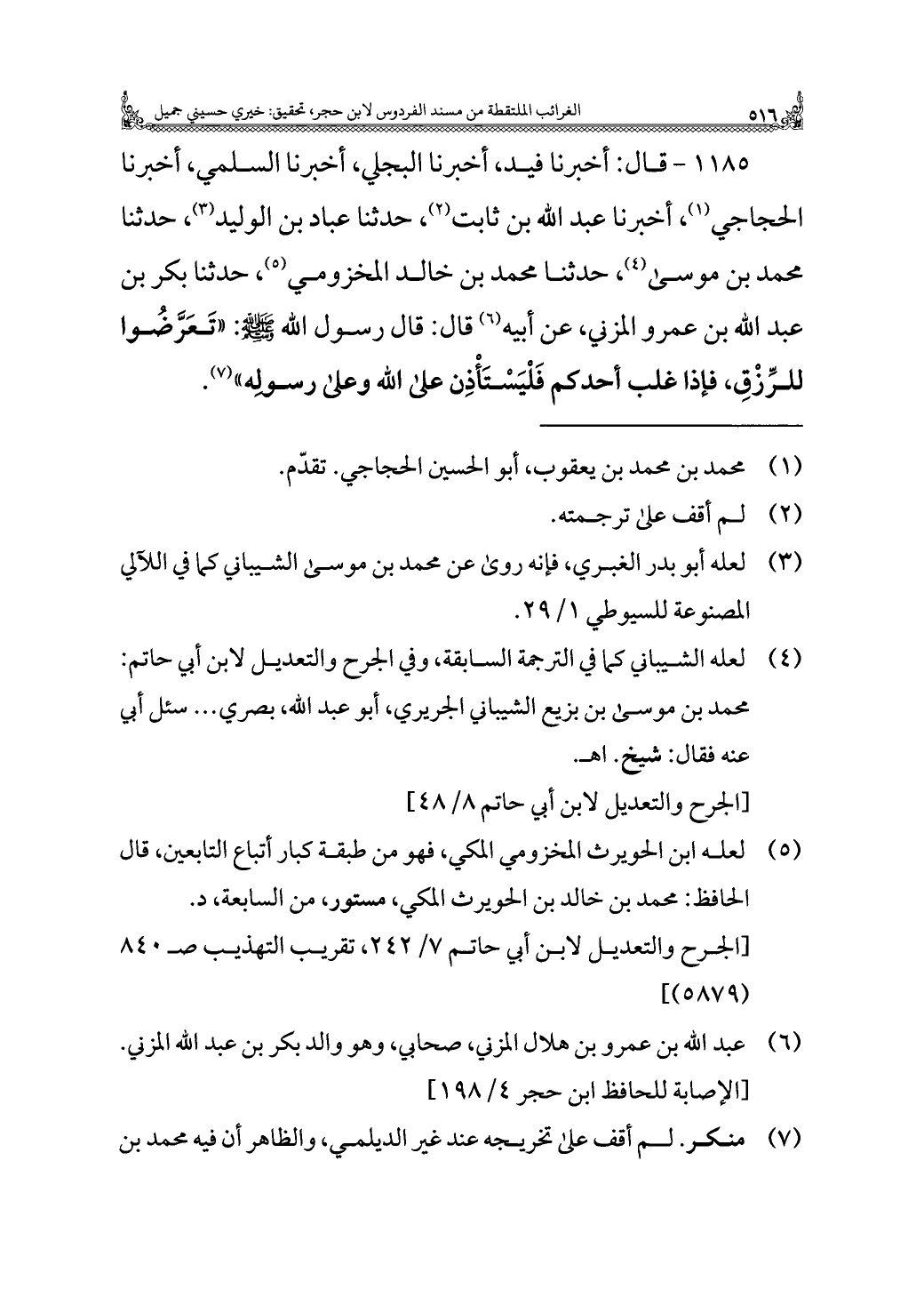 ١١٨٥ - قال: أخبرنا فيد، أخبرنا البجلي، أخبرنا السلمي، أخبرنا الحجاجي (¬١)، أخبرنا عبد الله بن ثابت (¬٢)، حدثنا عباد بن الوليد (¬٣)، حدثنا محمد بن موسى (¬٤)، حدثنا محمد بن خالد المخزومي (¬٥)، حدثنا بكر بن عبد الله بن عمرو المزني، عن أبيه (¬٦) قال: قال رسول الله - صلى الله عليه وسلم -: "تَعَرَّضُوا للرِّزْقِ، فإذا غلب أحدكم فَلْيَسْتَأْذِن على الله وعلى رسولِه" (¬٧).