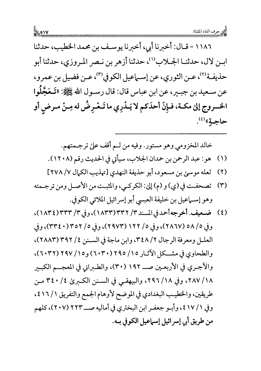 ١١٨٦ - قال: أخبرنا أبي، أخبرنا يوسف بن محمد الخطيب، حدثنا ابن لال، حدثنا الجلاب (¬١)، حدثنا أزهر بن نصر المروزي، حدثنا أبو حذيفة (¬٢)، عن الثوري، عن إسماعيل الكوفي (¬٣)، عن فضيل بن عمرو، عن سعيد بن جبير، عن ابن عباس قال: قال رسول الله - صلى الله عليه وسلم -: "تَعَجَّلُوا الخروج إلى مكة، فإِنّ أحدَكم لا يَدْرِي ما تَعْرِضُ له مِنْ مرضٍ أو حاجةٍ" (¬٤).