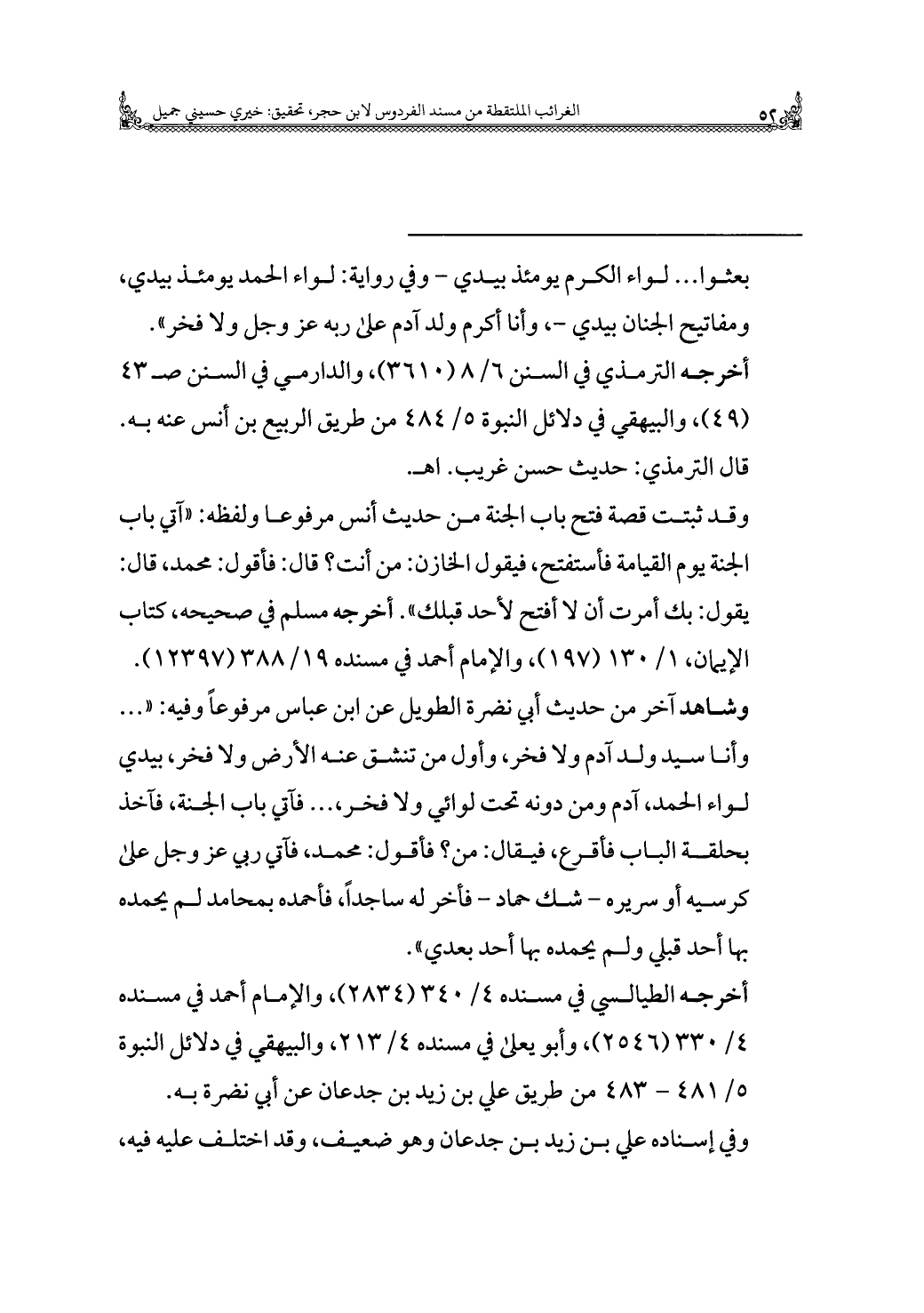 وقد ثبتت قصة فتح باب الجنة من حديث أنس مرفوعا ولفظه: "آتي باب الجنة يوم القيامة فأستفتح، فيقول الخازن: من أنت؟ قال: فأقول: محمد، قال: يقول: بك أمرت أن لا أفتح لأحد قبلك". أخرجه مسلم في صحيحه، كتاب الإيمان، ١/ ١٣٠ (١٩٧)، والإمام أحمد في مسنده ١٩/ ٣٨٨ (١٢٣٩٧). وشاهد آخر من حديث أبي نضرة الطويل عن ابن عباس مرفوعًا وفيه: " ... وأنا سيد ولد آدم ولا فخر، وأول من تنشق عنه الأرض ولا فخر، بيدي لواء الحمد، آدم ومن دونه تحت لوائي ولا فخر، ... فآتي باب الجنة، فآخذ بحلقة الباب فأقرع، فيقال: من؟ فأقول: محمد، فآتي ربي عز وجل على كرسيه أو سريره - شك حماد - فأخر له ساجدًا، فاحمده بمحامد لم يحمده بها أحد قبلي ولم يحمده بها أحد بعدي".