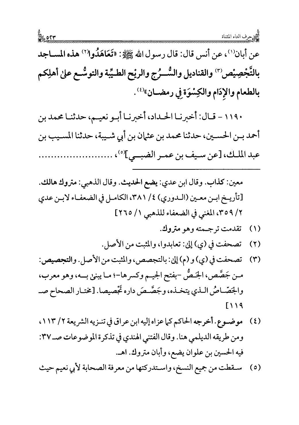 عن أبان (¬١)، عن أنس قال: قال رسول الله - صلى الله عليه وسلم -: "تَعَاهَدُوا (¬٢) هذه المساجد بالتَّجْصِيْص (¬٣) والقناديل والسُّرُج والريْح الطيِّبة والتوسُّع على أهلِكم بالطعام والإِدَام والكِسْوَة فِي رمضان" (¬٤).