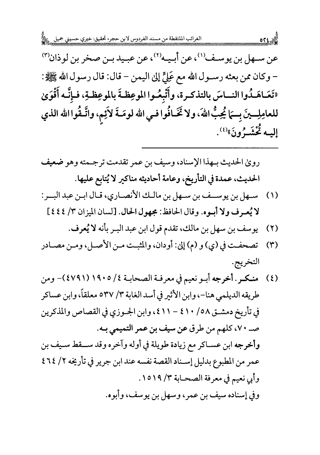 (¬١) سهل بن يوسف بن سهل بن مالك الأنصاري، قال ابن عبد البر: لا يُعرف ولا أبوه. وقال الحافظ: مجهول الحال. [لسان الميزان ٣/ ٤٤٤]