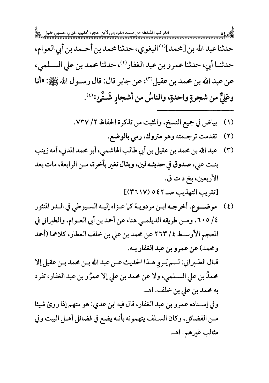 حدثنا عبد الله بن [محمد] (¬١) البغوي، حدثنا محمد بن أحمد بن أبي العوام، حدثنا أبي، حدثنا عمرو بن عبد الغفار (¬٢)، حدثنا محمد بن علي السلمي، عن عبد الله بن محمد بن عقيل (¬٣)، عن جابر قال: قال رسول الله - صَلَّى اللهُ عَلَيْهِ وَسَلَّمَ -: "أنا وعَلِيٌّ من شجرةٍ واحدةٍ، والناسُ من أشجارٍ شَتَّى" (¬٤).