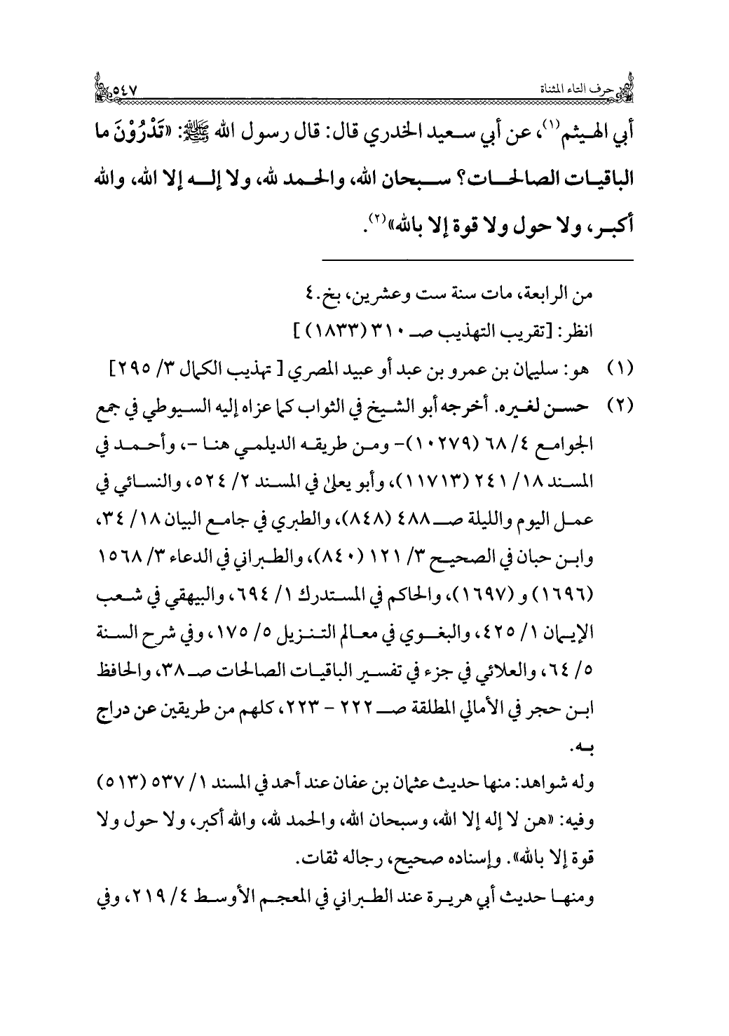 أبي الهيثم (¬١)، عن أبي سعيد الخدري قال: قال رسول الله - صلى الله عليه وسلم -: "تَدْرُوْنَ ما الباقيات الصالحات؟ سبحان الله، والحمد لله، ولا إله إلا الله، والله أكبر، ولا حول ولا قوة إلا بالله" (¬٢).