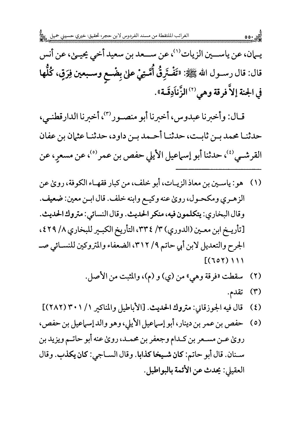 يمان، عن ياسين الزيات (¬١)، عن سعد بن سعيد أخي يحيى، عن أنس قال: قال رسول الله - صلى الله عليه وسلم -: "تَفْتَرِقُ أُمَّتِيْ على بِضْعٍ وسبعين فِرَقٍ، كُلُّها في الجنة إلَّا فرقة وهي (¬٢) الزَّنَادِقَة".