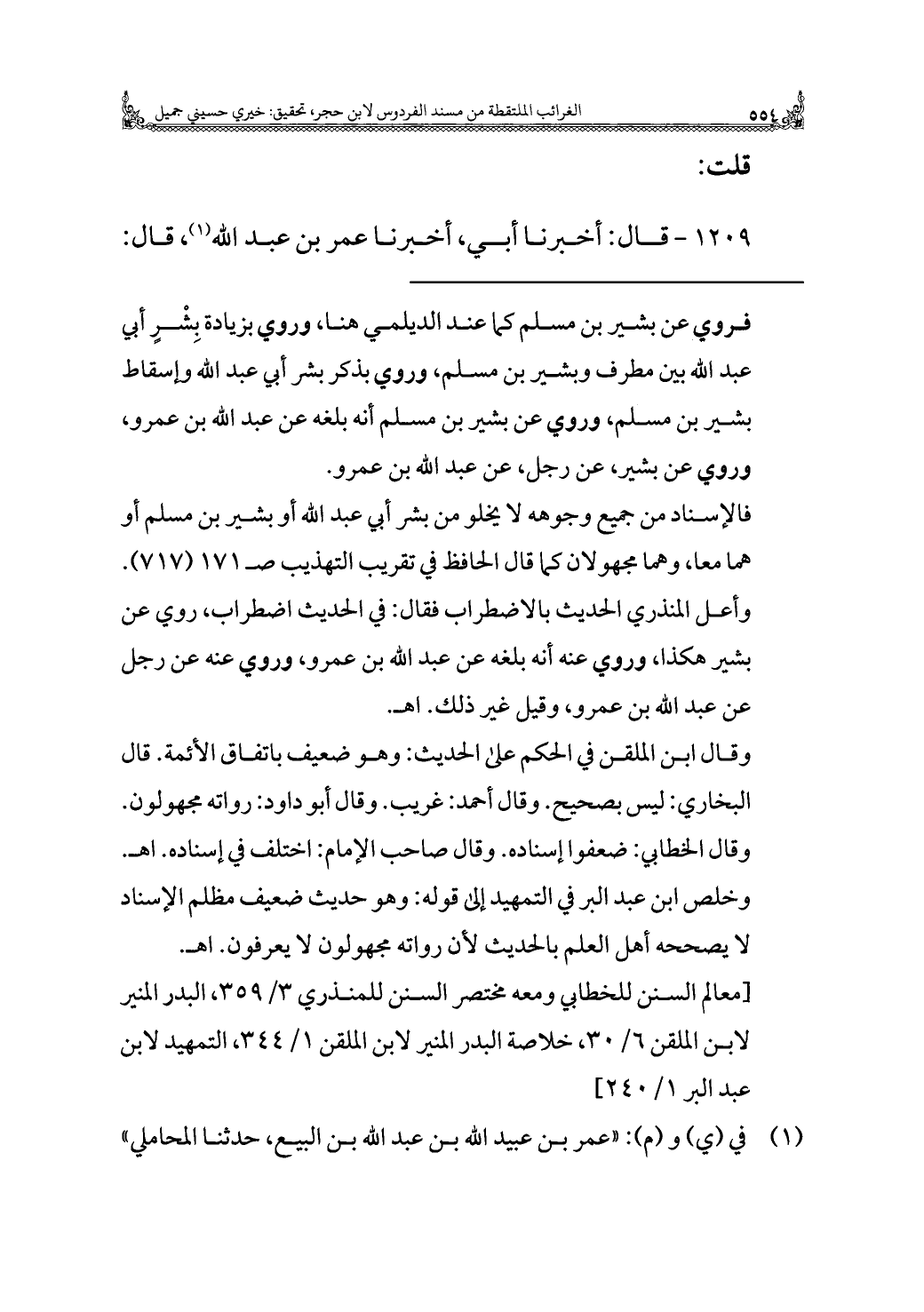 = فروي عن بشير بن مسلم كما عند الديلمي هنا، وروي بزيادة بِشْرٍ أبي عبد الله بين مطرف وبشير بن مسلم، وروي بذكر بشر أبي عبد الله وإسقاط بشير بن مسلم، وروي عن بشير بن مسلم أنه بلغه عن عبد الله بن عمرو، وروي عن بشير، عن رجل، عن عبد الله بن عمرو.