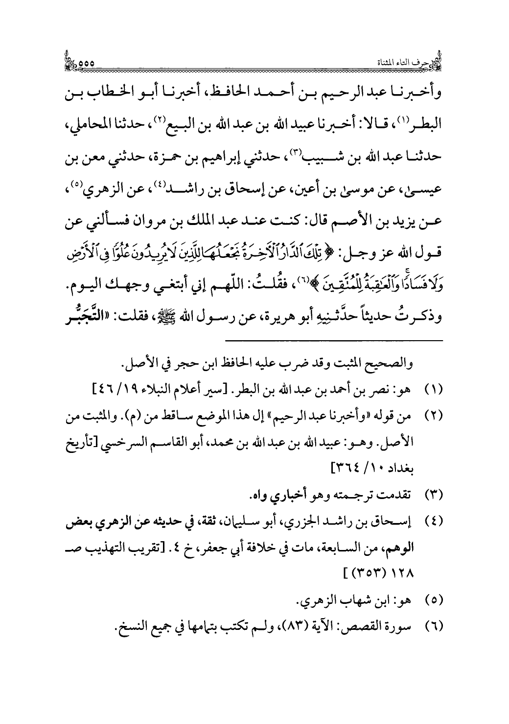 وأخبرنا عبد الرحيم بن أحمد الحافظ، أخبرنا أبو الخطاب بن البطر (¬١)، قالا: أخبرنا عبيد الله بن عبد الله بن البيع (¬٢)، حدثنا المحاملي، حدثنا عبد الله بن شبيب (¬٣)، حدثني إبراهيم بن حمزة، حدثني معن بن عيسى، عن موسى بن أعين، عن إسحاق بن راشد (¬٤)، عن الزهري (¬٥)، عن يزيد بن الأصم قال: كنت عند عبد الملك بن مروان فسألني عن قول الله عز وجل: {تِلْكَ الدَّارُ الْآخِرَةُ نَجْعَلُهَا لِلَّذِينَ لَا يُرِيدُونَ عُلُوًّا فِي الْأَرْضِ وَلَا فَسَادًا وَالْعَاقِبَةُ لِلْمُتَّقِينَ} (¬٦)، فقُلتُ: اللهم إني أبتغي وجهك اليوم. وذكرتُ حديثًا حدَّثنِيهِ أبو هريرة، عن رسول الله - صلى الله عليه وسلم -، فقلت: "التَّجَبُّر