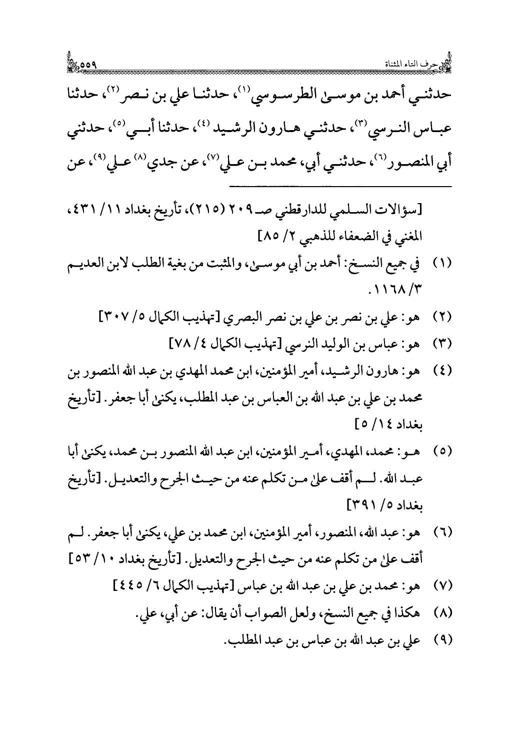 (¬٥) هو: محمد، المهدي، أمير المؤمنين، ابن عبد الله المنصور بن محمد، يكنى أبا عبد الله. لم أقف على من تكلم عنه من حيث الجرح والتعديل. [تاريخ بغداد ٥/ ٣٩١].