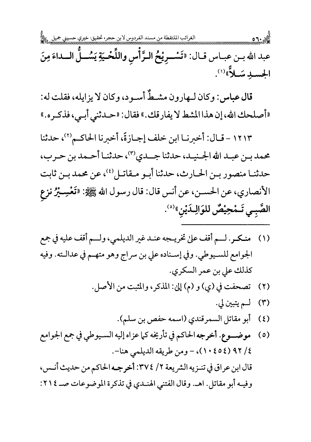 ١٢١٣ - قال: أخبرنا ابن خلف إجازةً، أخبرنا الحاكم (¬٢)، حدثنا محمد بن عبد الله الجنيد، حدثنا جدي (¬٣)، حدثنا أحمد بن حرب، حدثنا منصور بن الحارث، حدثنا أبو مقاتل (¬٤)، عن محمد بن ثابت الأنصاري، عن الحسن، عن أنس قال: قال رسول الله - صلى الله عليه وسلم -: "تَعْسِيْرُ نزعِ الصَّبِي تَمْحِيْصٌ للوَالِدَيْنِ" (¬٥).