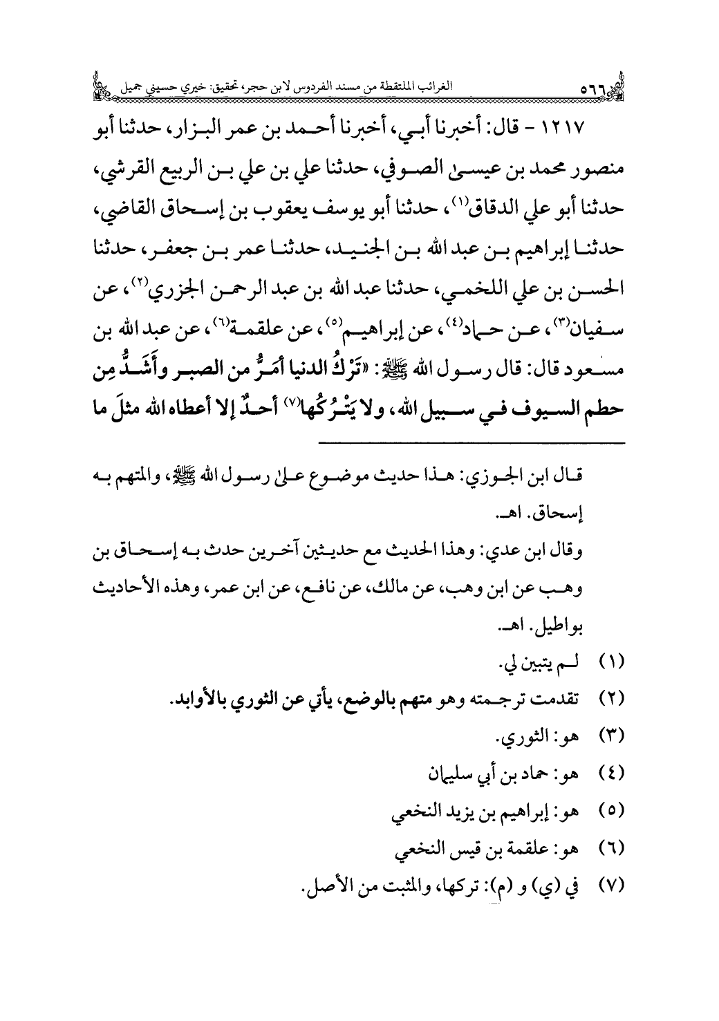 ١٢١٧ - قال: أخبرنا أبي، أخبرنا أحمد بن عمر البزار، حدثنا أبو منصور محمد بن عيسى الصوفي، حدثنا علي بن علي بن الربيع القرشي، حدثنا أبو علي الدقاق (¬١)، حدثنا أبو يوسف يعقوب بن إسحاق القاضي، حدثنا إبراهيم بن عبد الله بن الجنيد، حدثنا عمر بن جعفر، حدثنا الحسن بن علي اللخمي، حدثنا عبد الله بن عبد الرحمن الجزري (¬٢)، عن سفيان (¬٣)، عن حماد (¬٤)، عن إبراهيم (¬٥)، عن علقمة (¬٦)، عن عبد الله بن مسعود قال: قال رسول الله - صلى الله عليه وسلم -: "تَرْكُ الدنيا أمَرُّ من الصبر وأَشَدُّ مِن حطم السيوف في سبيل الله، ولا يَتْرُكُها (¬٧) أحدٌ إلا أعطاه الله مثلَ ما
