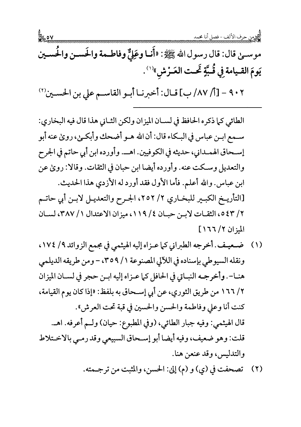 موسى قال: قال رسول الله - صَلَّى اللهُ عَلَيْهِ وَسَلَّمَ -: "أَنا وعَلِيٌّ وفاطمة والحَسن والحُسين يَومَ القيامة فِي قُبَّهٍ تَحت العَرْشِ" (¬١).