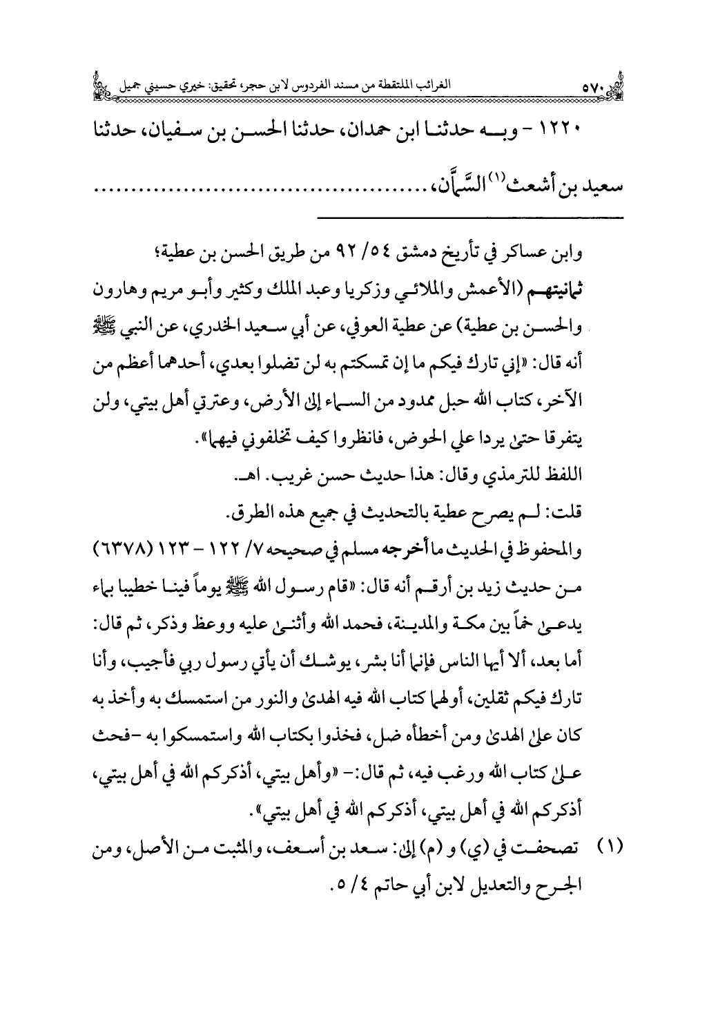 ثمانيتهم (الأعمش والملائي وزكريا وعبد الملك وكثير وأبو مريم وهارون والحسن بن عطية) عن عطية العوفي، عن أبي سعيد الخدري، عن النبي - صلى الله عليه وسلم - أنه قال: "إني تارك فيكم ما إن تمسكتم به لن تضلوا بعدي، أحدهما أعظم من الآخر، كتاب الله حبل ممدود من السماء إلى الأرض، وعترتي أهل بيتي، ولن يتفرقا حتى يردا علي الحوض، فانظروا كيف تخلفوني فيهما".