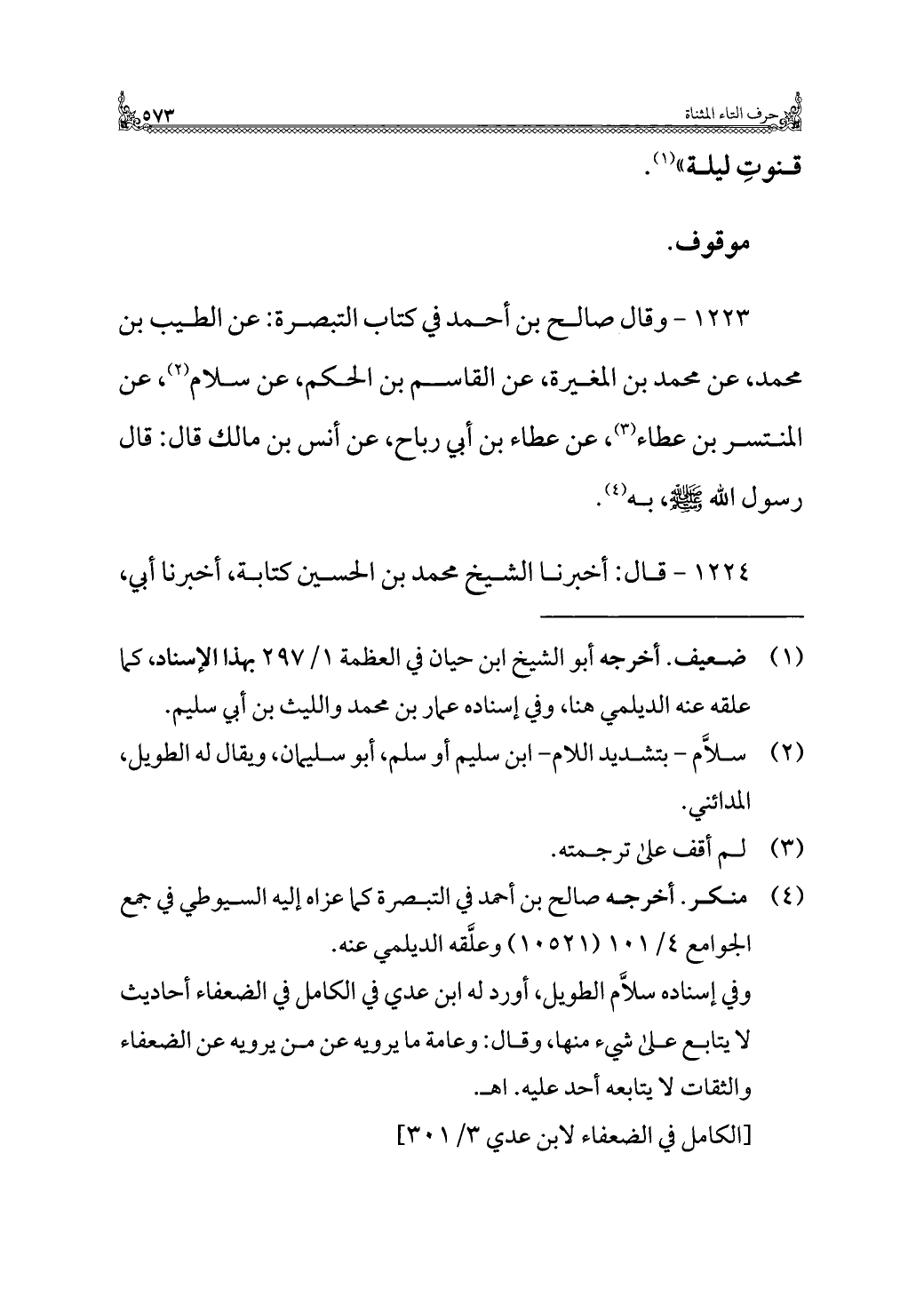 [الكامل في الضعفاء لابن عدي ٣/ ٣٠١].