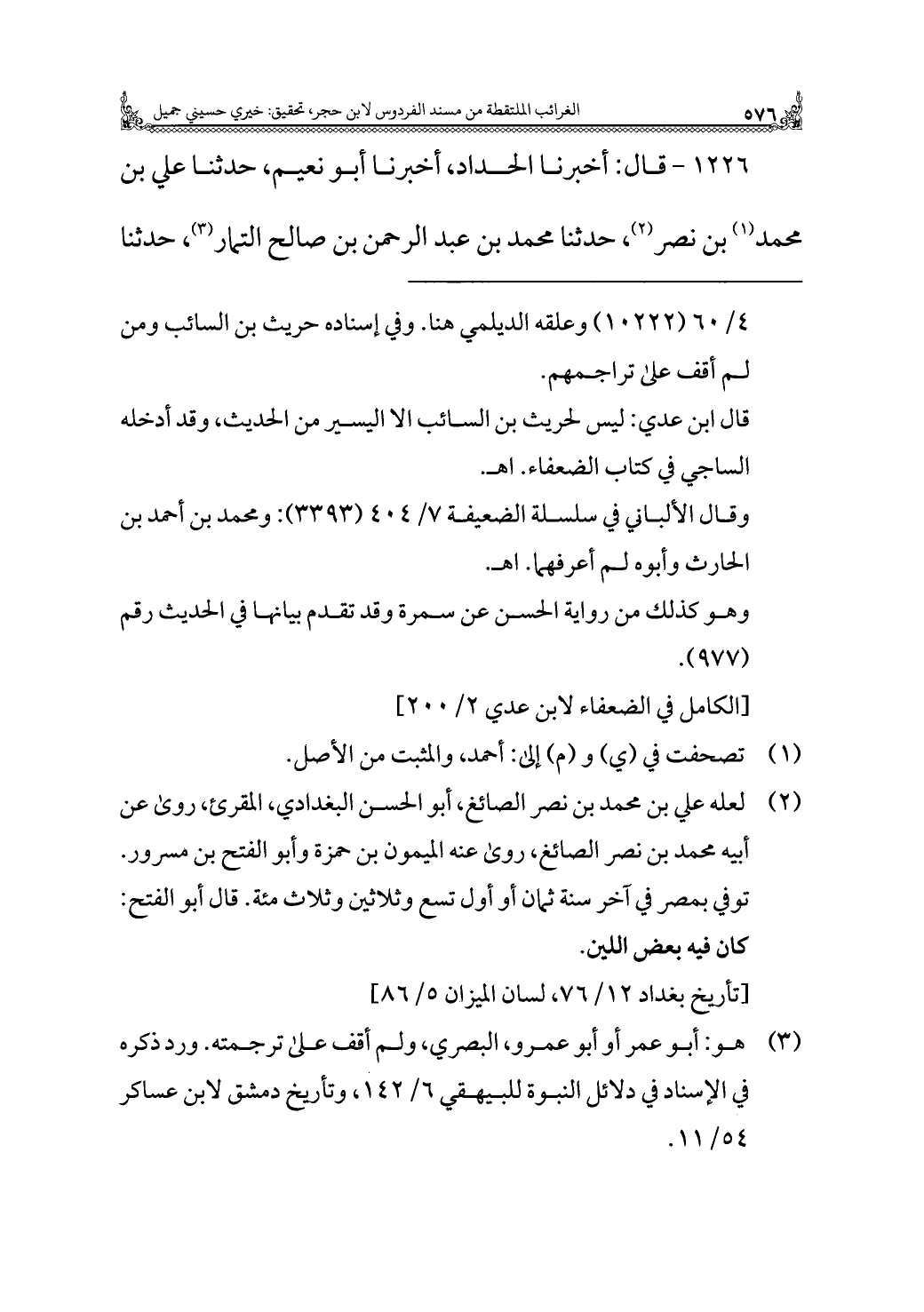 ١٢٢٦ - قال: أخبرنا الحداد، أخبرنا أبو نعيم، حدثنا علي بن محمد (¬١) بن نصر (¬٢)، حدثنا محمد بن عبد الرحمن بن صالح التمار (¬٣)، حدثنا