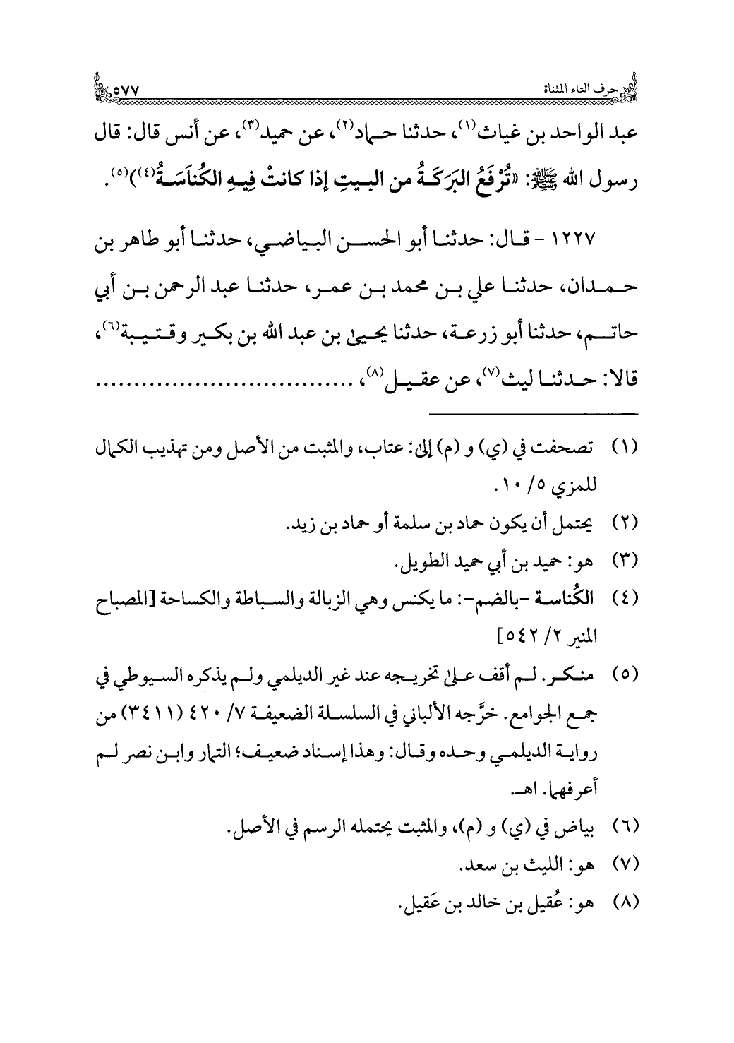 عبد الواحد بن غياث (¬١)، حدثنا حماد (¬٢)، عن حميد (¬٣)، عن أنس قال: قال رسول الله - صلى الله عليه وسلم -: "تُرْفَعُ البَرَكَةُ من البيتِ إذا كانتْ فِيهِ الكُناَسَةُ) (¬٤) (¬٥).