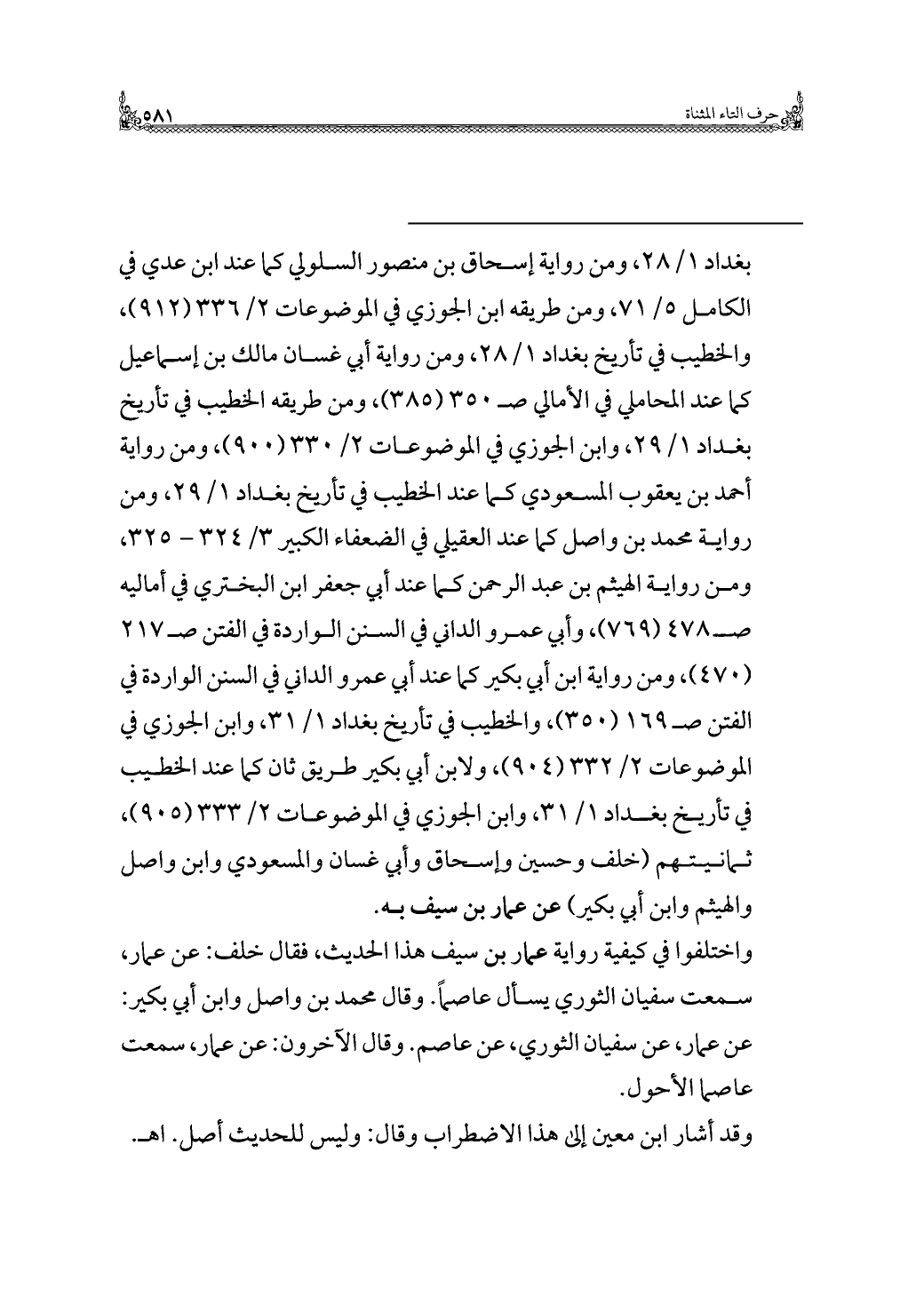 = بغداد ١/ ٢٨، ومن رواية إسحاق بن منصور السلولي كما عند ابن عدي في الكامل ٥/ ٧١، ومن طريقه ابن الجوزي في الموضوعات ٢/ ٣٣٦ (٩١٢)، والخطيب في تاريخ بغداد ١/ ٢٨، ومن رواية أبي غسان مالك بن إسماعيل كما عند المحاملي في الأمالي صـ ٣٥٠ (٣٨٥)، ومن طريقه الخطيب في تاريخ بغداد ١/ ٢٩، وابن الجوزي في الموضوعات ٢/ ٣٣٠ (٩٠٠)، ومن رواية أحمد بن يعقوب المسعودي كما عند الخطيب في تاريخ بغداد ١/ ٢٩، ومن رواية محمد بن واصل كما عند العقيلي في الضعفاء الكبير ٣/ ٣٢٤ - ٣٢٥، ومن رواية الهيثم بن عبد الرحمن كما عند أبي جعفر ابن البختري في أماليه صـ ٤٧٨ (٧٦٩)، وأبي عمرو الداني في السنن الواردة في الفتن صـ ٢١٧ (٤٧٠)، ومن رواية ابن أبي بكير كما عند أبي عمرو الداني في السنن الواردة في الفتن صـ ١٦٩ (٣٥٠)، والخطيب في تاريخ بغداد ١/ ٣١، وابن الجوزي في الموضوعات ٢/ ٣٣٢ (٩٠٤)، ولابن أبي بكير طريق ثان كما عند الخطيب في تاريخ بغداد ١/ ٣١، وابن الجوزي في الموضوعات ٢/ ٣٣٣ (٩٠٥)، ثمانيتهم (خلف وحسين وإسحاق وأبي غسان والمسعودي وابن واصل والهيثم وابن أبي بكير) عن عمار بن سيف به.
