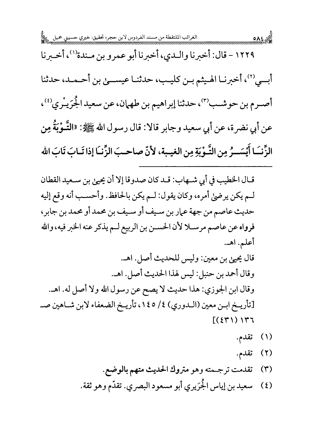 ١٢٢٩ - قال: أخبرنا والدي، أخبرنا أبو عمرو بن مندة (¬١)، أخبرنا أبي (¬٢)، أخبرنا الهيثم بن كليب، حدثنا عيسى بن أحمد، حدثنا أصرم بن حوشب (¬٣)، حدثنا إبراهيم بن طهمان، عن سعيد الجُرَيْري (¬٤)، عن أبي نضرة، عن أبي سعيد وجابر قالا: قال رسول الله - صلى الله عليه وسلم -: "التَّوْبَةُ مِن الزِّنَا أَيْسَرُ مِن التَّوْبَةِ مِن الغيبة، لأنّ صاحبَ الزِّنَا إذا تَابَ تَابَ الله