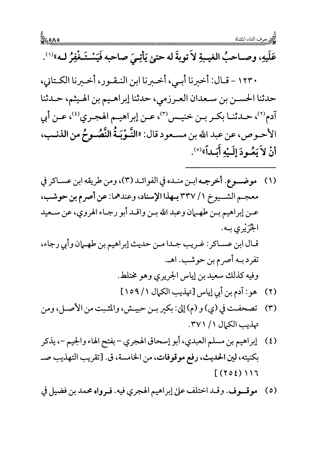 ١٢٣٠ - قال: أخبرنا أبي، أخبرنا ابن النقور، أخبرنا الكتاني، حدثنا الحسن بن سعدان العرزمي، حدثنا إبراهيم بن الهيثم، حدثنا آدم (¬٢)، حدثنا بكر بن خنيس (¬٣)، عن إبراهيم الهجري (¬٤)، عن أبي الأحوص، عن عبد الله بن مسعود قال: "التَّوْبَةُ النَّصُوحُ من الذنب، أنْ لَا يَعُودَ إلَيْهِ أَبَدًا" (¬٥).