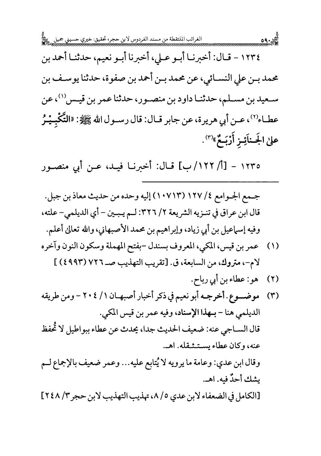 ١٢٣٤ - قال: أخبرنا أبو علي، أخبرنا أبو نعيم، حدثنا أحمد بن محمد بن علي النسائي، عن محمد بن أحمد بن صفوة، حدثنا يوسف بن سعيد بن مسلم، حدثنا داود بن منصور، حدثنا عمر بن قيس (¬١)، عن عطاء (¬٢)، عن أبي هريرة، عن جابر قال: قال رسول الله - صلى الله عليه وسلم -: "التَّكْبِيْرُ على الجَنَائِزِ أَرْبَعٌ" (¬٣).
