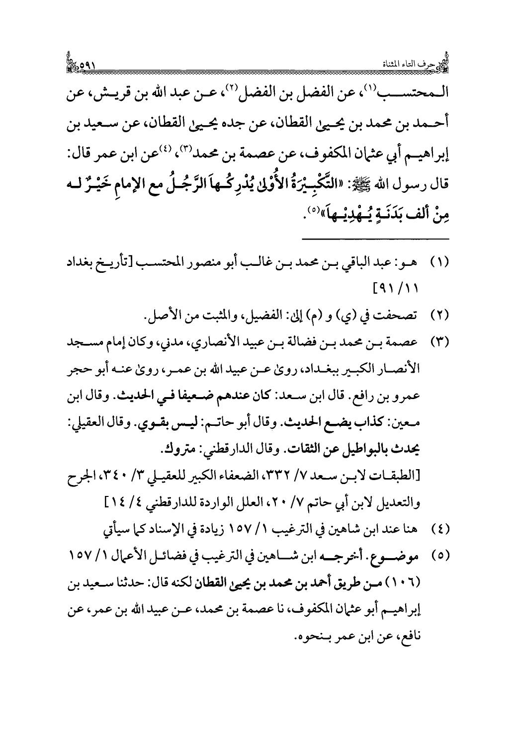المحتسب (¬١)، عن الفضل بن الفضل (¬٢)، عن عبد الله بن قريش، عن أحمد بن محمد بن يحيى القطان، عن جده يحيى القطان، عن سعيد بن إبراهيم أبي عثمان المكفوف، عن عصمة بن محمد (¬٣)، (¬٤) عن ابن عمر قال: قال رسول الله - صلى الله عليه وسلم -: "التَّكْبِيْرَةُ الأُوْلى يُدْرِكُهَا الرَّجُلُ مع الإمامِ خَيْرٌ له مِنْ ألف بَدَنَةٍ يُهْدِيْهَا" (¬٥).