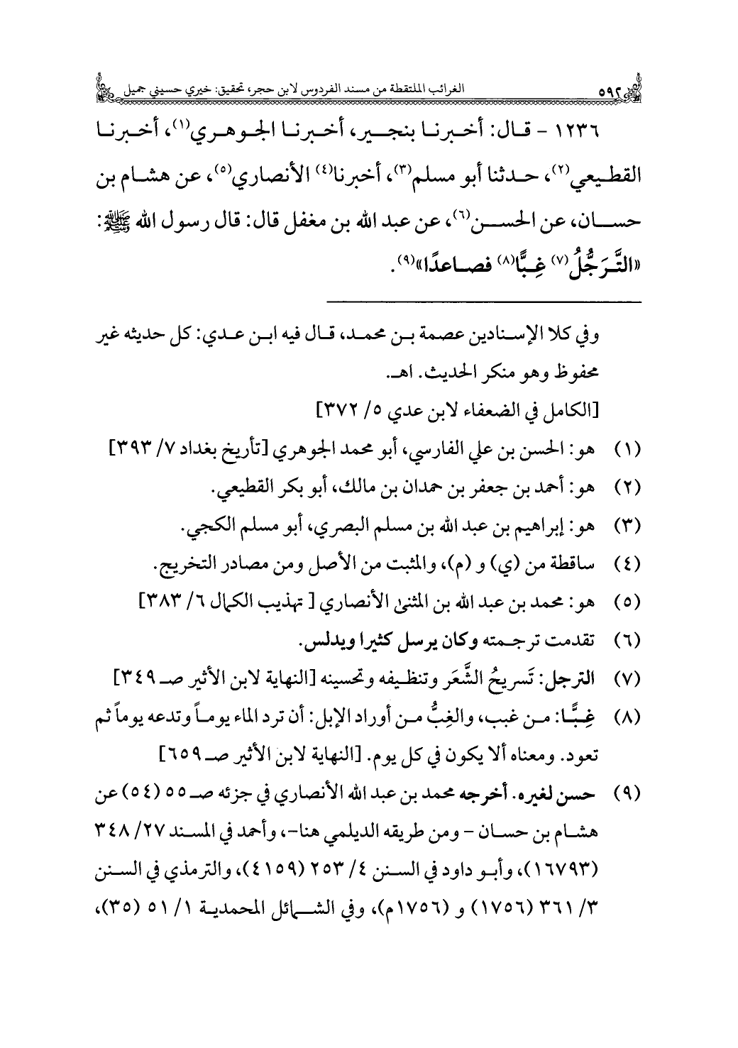 ١٢٣٦ - قال: أخبرنا بنجير، أخبرنا الجوهري (¬١)، أخبرنا القطيعي (¬٢)، حدثنا أبو مسلم (¬٣)، أخبرنا (¬٤) الأنصاري (¬٥)، عن هشام بن حسان، عن الحسن (¬٦)، عن عبد الله بن مغفل قال: قال رسول الله - صلى الله عليه وسلم -: "التَّرَجُّلُ (¬٧) غِبًّا (¬٨) فصاعدًا" (¬٩).