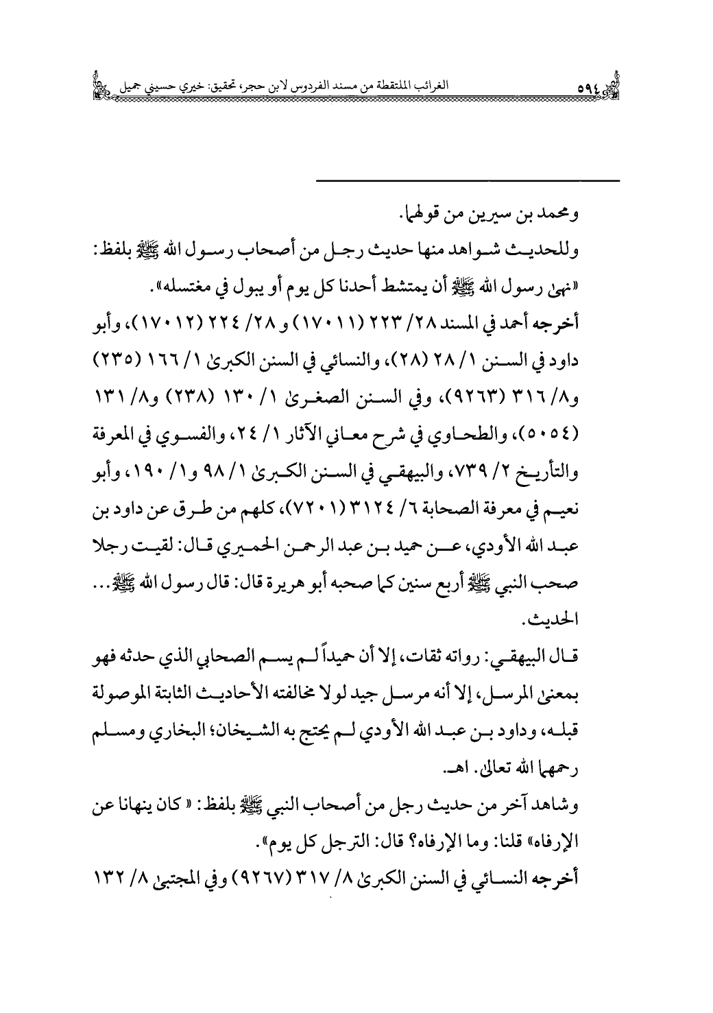 أخرجه أحمد في المسند ٢٨/ ٢٢٣ (١٧٠١١) و ٢٨/ ٢٢٤ (١٧٠١٢)، وأبو داود في السنن ١/ ٢٨ (٢٨)، والنسائي في السنن الكبرى ١/ ١٦٦ (٢٣٥) و ٨/ ٣١٦ (٩٢٦٣)، وفي السنن الصغرى ١/ ١٣٠ (٢٣٨) و ٨/ ١٣١ (٥٠٥٤)، والطحاوي في شرح معاني الآثار ١/ ٢٤، والفسوي في المعرفة والتاريخ ٢/ ٧٣٩، والبيهقي في السنن الكبرى ١/ ٩٨ و ١/ ١٩٠، وأبو نعيم في معرفة الصحابة ٦/ ٣١٢٤ (٧٢٠١)، كلهم من طرق عن داود بن عبد الله الأودي، عن حميد بن عبد الرحمن الحميري قال: لقيت رجلا صحب النبي - صلى الله عليه وسلم - أربع سنين كما صحبه أبو هريرة قال: قال رسول الله - صلى الله عليه وسلم -. . . الحديث.