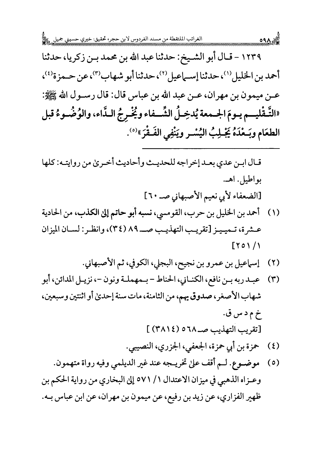 ١٢٣٩ - قال أبو الشيخ: حدثنا عبد الله بن محمد بن زكريا، حدثنا أحمد بن الخليل (¬١)، حدثنا إسماعيل (¬٢)، حدثنا أبو شهاب (¬٣)، عن حمزة (¬٤)، عن ميمون بن مهران، عن عبد الله بن عباس قال: قال رسول الله - صلى الله عليه وسلم -: "التَّقْليم يومَ الجمعة يُدخِلُ الشِّفاء ويُخْرِجُ الدَّاء، والوُضُوءُ قبل الطعَام وبَعْدَهُ يَجْلِبُ اليُسْر ويَنْفِي الفَقْرَ" (¬٥).