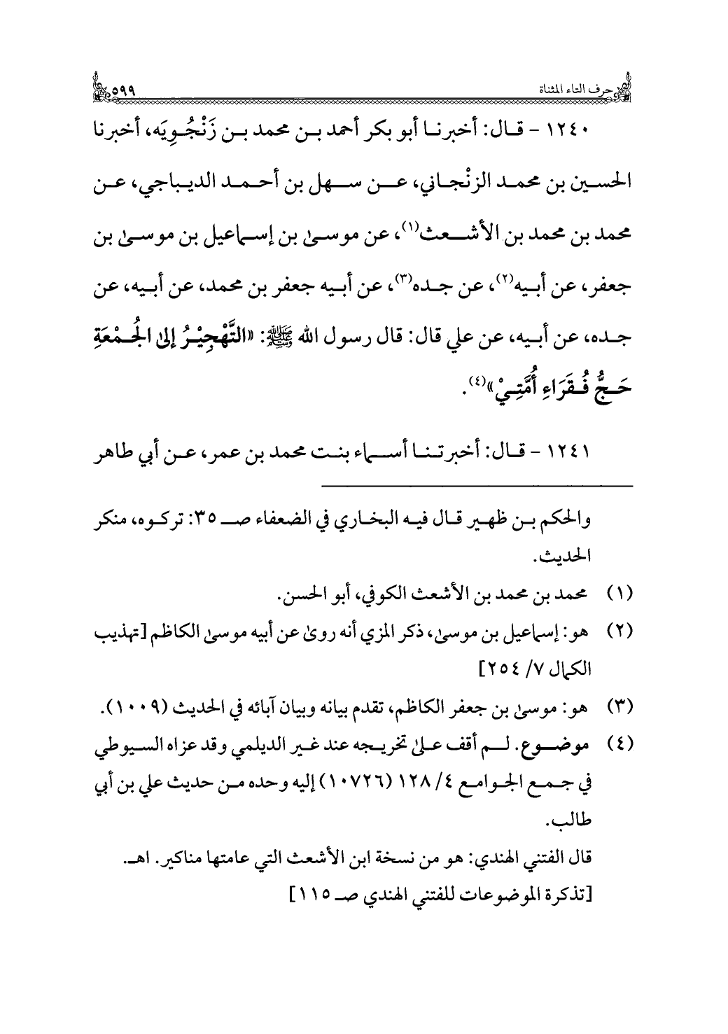 ١٢٤٠ - قال: أخبرنا أبو بكر أحمد بن محمد بن زَنْجُوِيَه، أخبرنا الحسين بن محمد الزنْجاني، عن سهل بن أحمد الديباجي، عن محمد بن محمد بن الأشعث (¬١)، عن موسى بن إسماعيل بن موسى بن جعفر، عن أبيه (¬٢)، عن جده (¬٣)، عن أبيه جعفر بن محمد، عن أبيه، عن جده، عن أبيه، عن علي قال: قال رسول الله - صلى الله عليه وسلم -: "التَّهْجِيْرُ إلى الجُمْعَةِ حَجُّ فُقَرَاءِ أُمَّتِيْ" (¬٤).