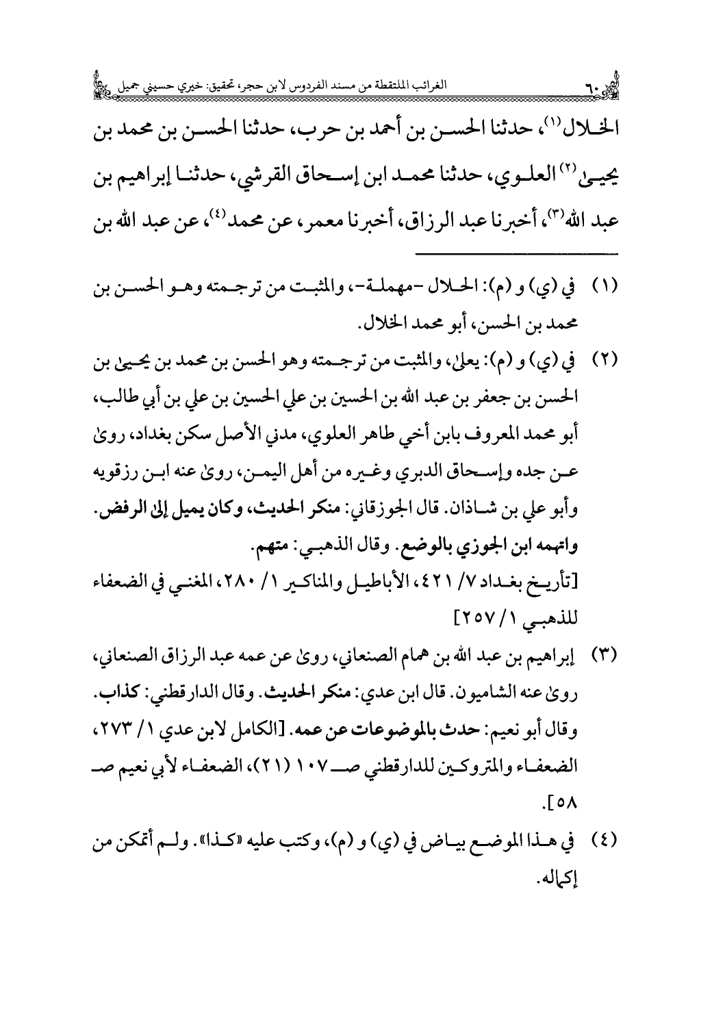 (¬٣) إبراهيم بن عبد الله بن همام الصنعاني، روى عن عمه عبد الرزاق الصنعاني، روى عنه الشاميون. قال ابن عدي: منكر الحديث. وقال الدارقطني: كذاب. وقال أبو نعيم: حدث بالموضوعات عن عمه. [الكامل لابن عدي ١/ ٢٧٣، الضعفاء والمتروكين للدارقطني صـ ١٠٧ (٢١)، الضعفاء لأبي نعيم صـ ٥٨].