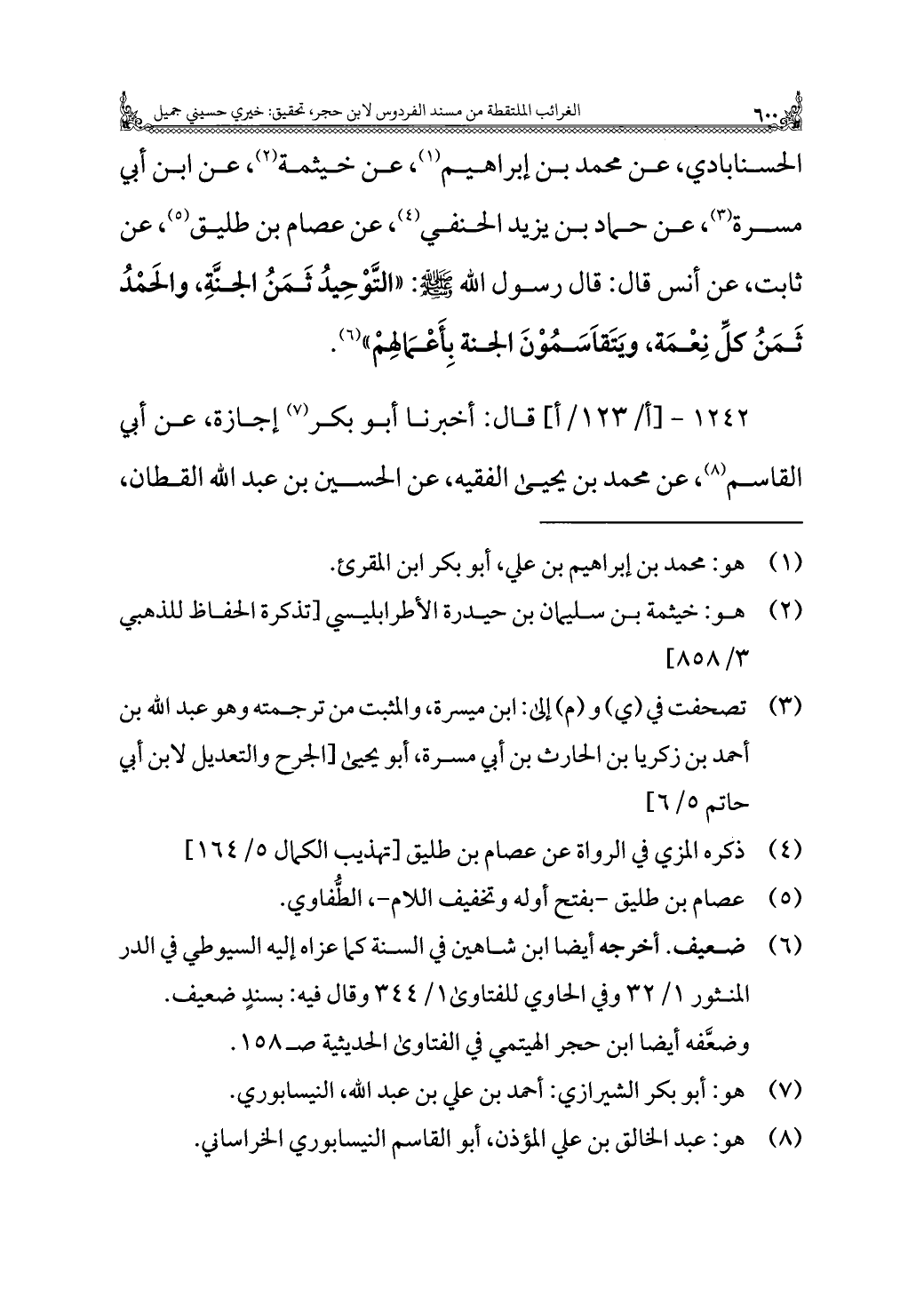 الحسنابادي، عن محمد بن إبراهيم (¬١)، عن خيثمة (¬٢)، عن ابن أبي مسرة (¬٣)، عن حماد بن يزيد الحنفي (¬٤)، عن عصام بن طليق (¬٥)، عن ثابت، عن أنس قال: قال رسول الله - صلى الله عليه وسلم -: "التَّوْحِيدُ ثَمَنُ الجنَّةِ، والحَمْدُ ثَمَنُ كلِّ نِعْمَة، ويَتَقَاسَمُوْنَ الجنة بِأَعْمَالهِمْ" (¬٦).