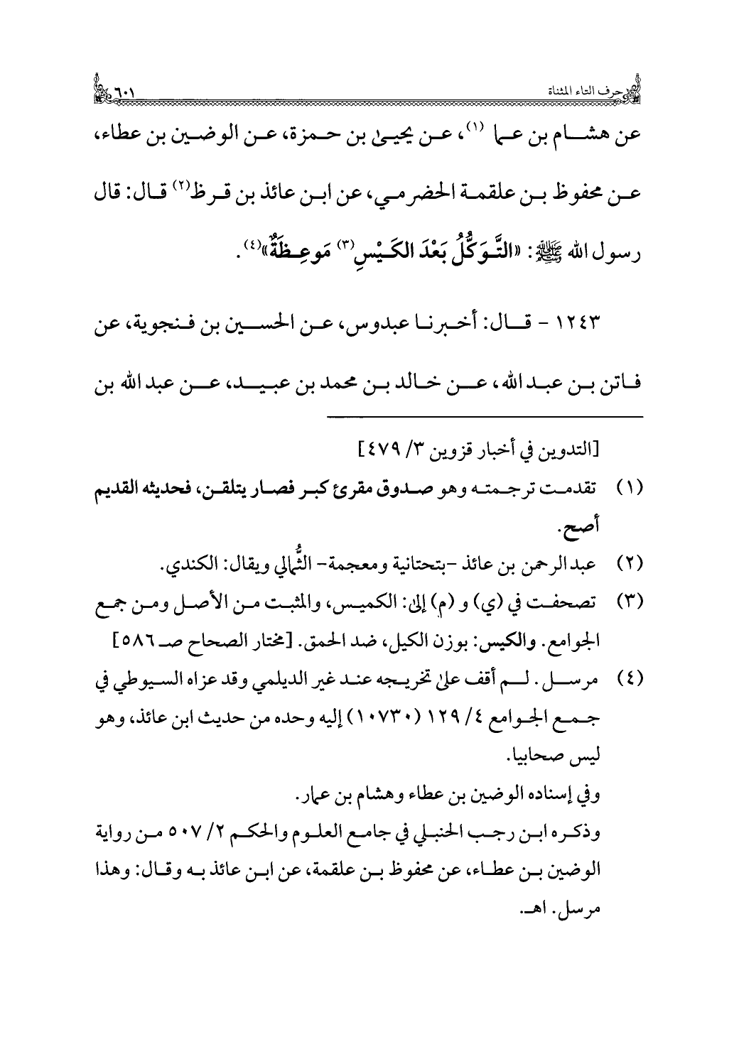 عن هشام بن عما (¬١)، عن يحيى بن حمزة، عن الوضين بن عطاء، عن محفوظ بن علقمة الحضرمي، عن ابن عائذ بن قرظ (¬٢) قال: قال رسول الله - صلى الله عليه وسلم -: "التَّوَكُّلُ بَعْدَ الكَيْسِ (¬٣) مَوعِظَةٌ" (¬٤).