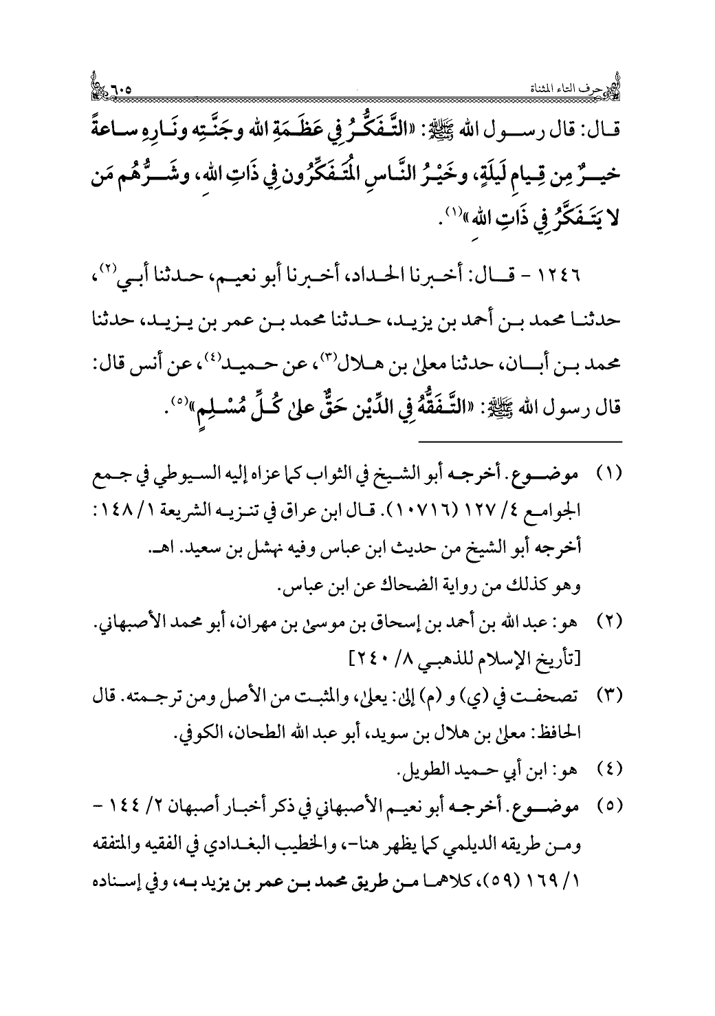 ١٢٤٦ - قال: أخبرنا الحداد، أخبرنا أبو نعيم، حدثنا أبي (¬٢)، حدثنا محمد بن أحمد بن يزيد، حدثنا محمد بن عمر بن يزيد، حدثنا محمد بن أبان، حدثنا معلى بن هلال (¬٣)، عن حميد (¬٤)، عن أنس قال: قال رسول الله - صلى الله عليه وسلم -: "التَّفَقُّهُ فِي الدِّيْن حَقٌّ على كُلِّ مُسْلِمٍ" (¬٥).