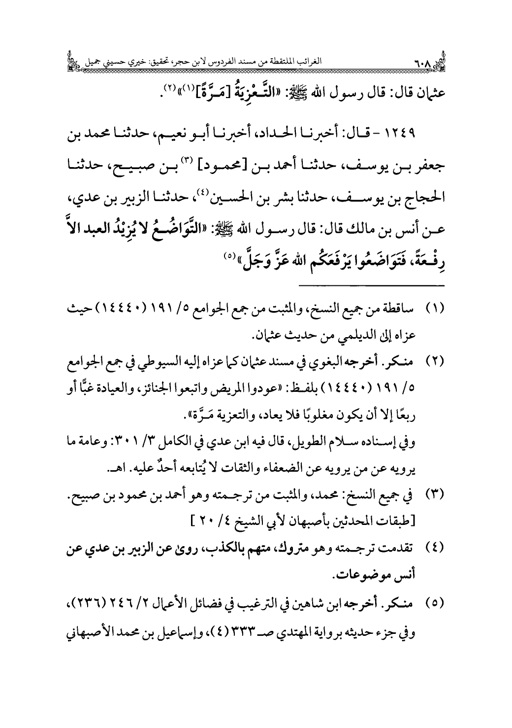 ١٢٤٩ - قال: أخبرنا الحداد، أخبرنا أبو نعيم، حدثنا محمد بن جعفر بن يوسف، حدثنا أحمد بن [محمود] (¬٣) بن صبيح، حدثنا الحجاج بن يوسف، حدثنا بشر بن الحسين (¬٤)، حدثنا الزبير بن عدي، عن أنس بن مالك قال: قال رسول الله - صلى الله عليه وسلم -: "التَّوَاضُعُ لا يُزِيْدُ العبد إلَّا رِفْعَةً، فتوَاضَعُوا يَرْفَعَكُم الله عَزَّ وَجَلَّ" (¬٥)