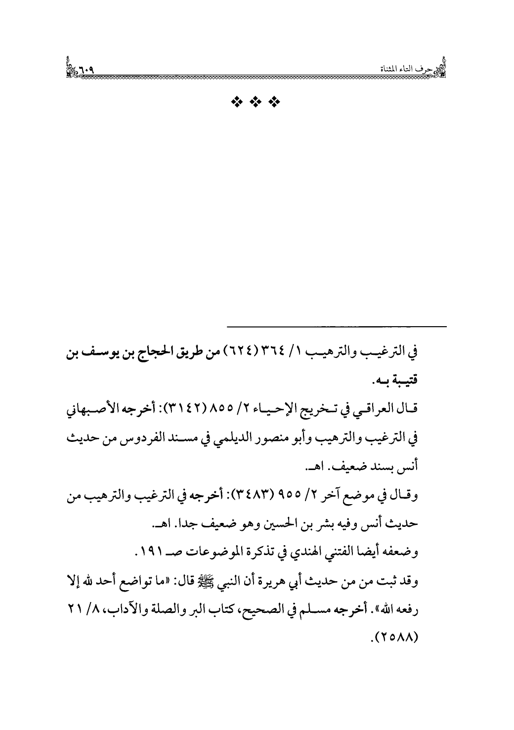 = في الترغيب والترهيب ١/ ٣٦٤ (٦٢٤) من طريق الحجاج بن يوسف بن قتيبة به.