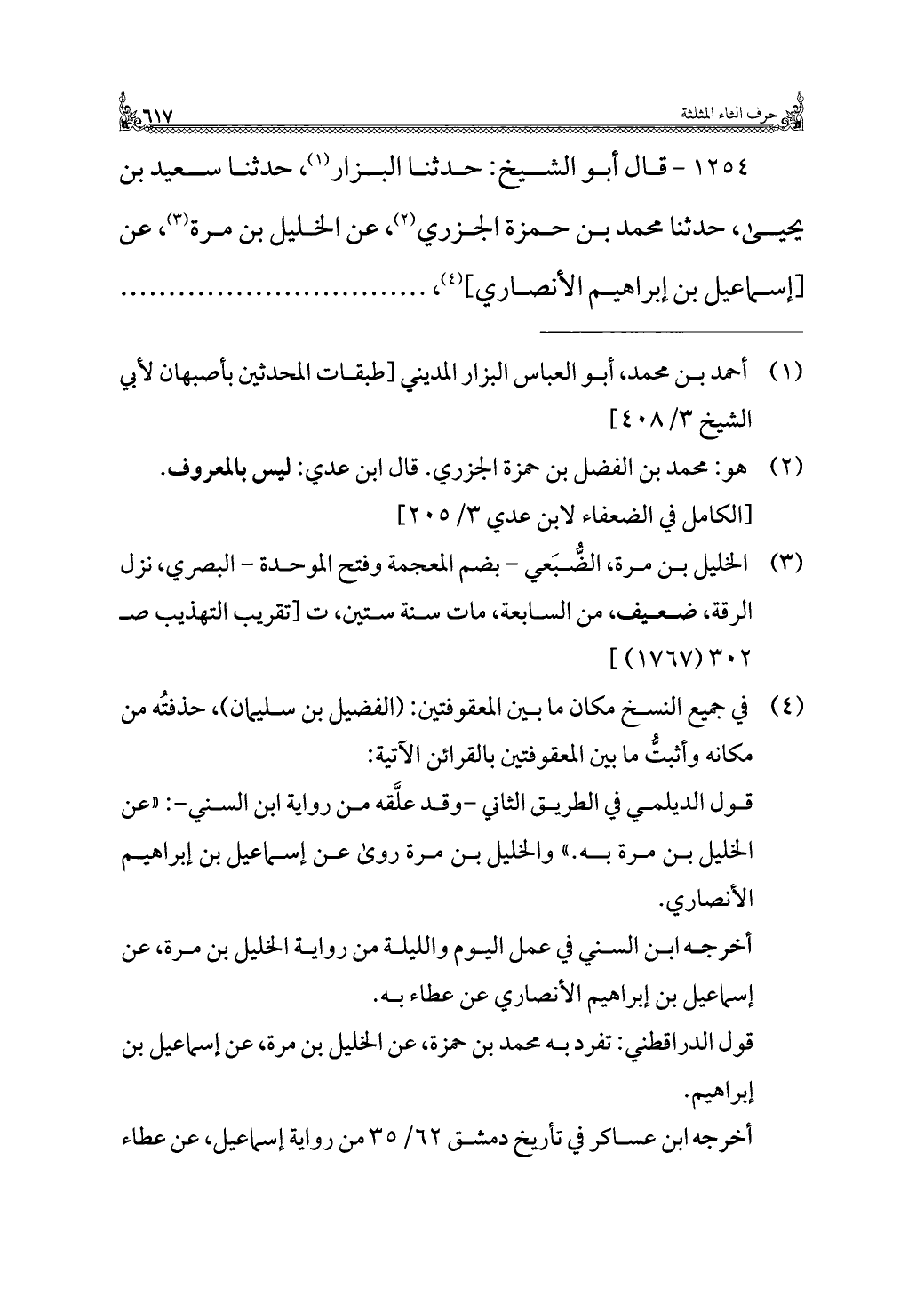 ١٢٥٤ - قال أبو الشيخ: حدثنا البزار (¬١)، حدثنا سعيد بن يحيى، حدثنا محمد بن حمزة الجزري (¬٢)، عن الخليل بن مرة (¬٣)، عن [إسماعيل بن إبراهيم الأنصاري] (¬٤)، . . . . . . . . . . . . . . .