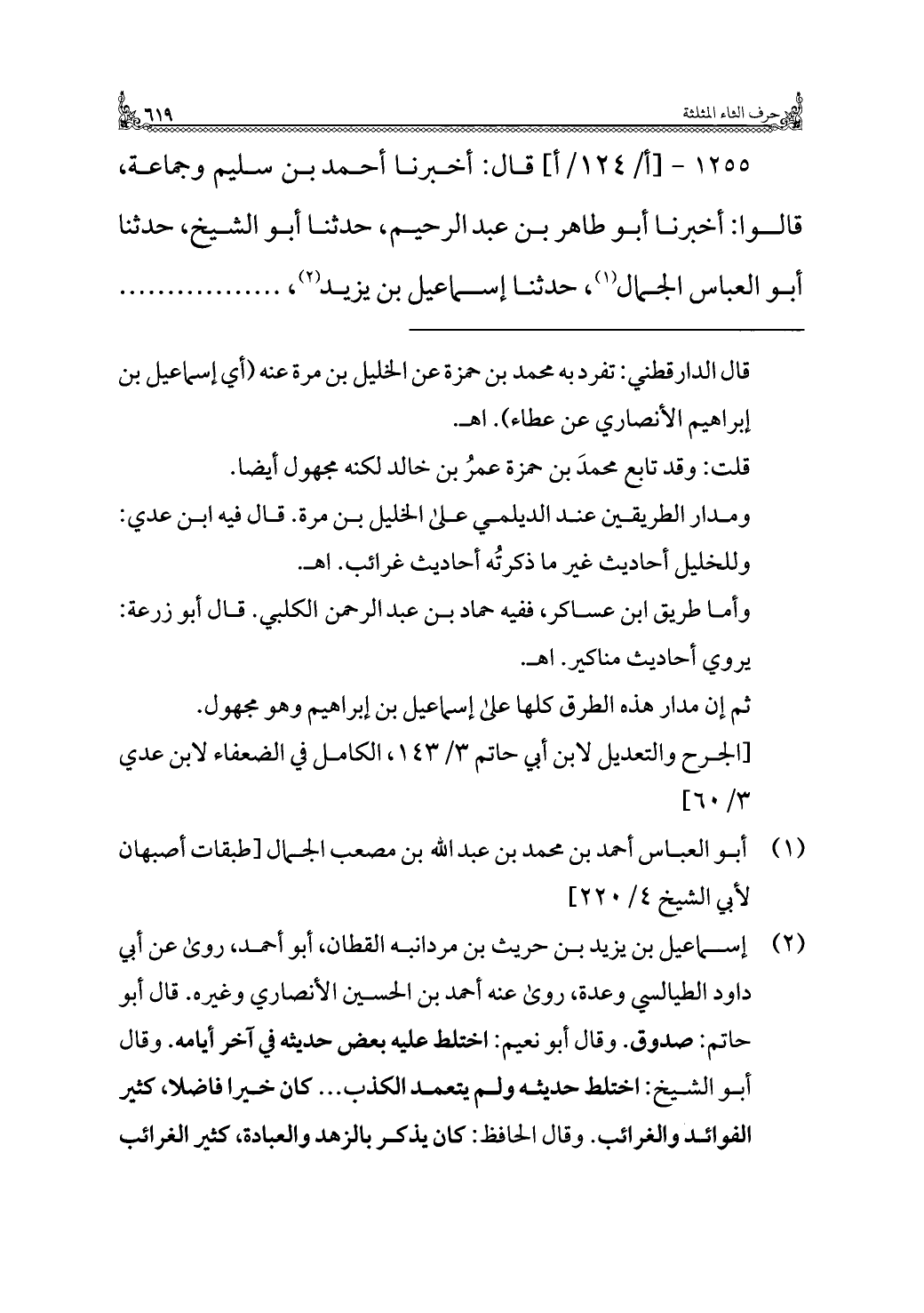١٢٥٥ - قال: أخبرنا أحمد بن سليم وجماعة، قالوا: أخبرنا أبو طاهر بن عبد الرحيم، حدثنا أبو الشيخ، حدثنا أبو العباس الجمال (¬١)، حدثنا إسماعيل بن يزيد (¬٢)، . . . . . . . .